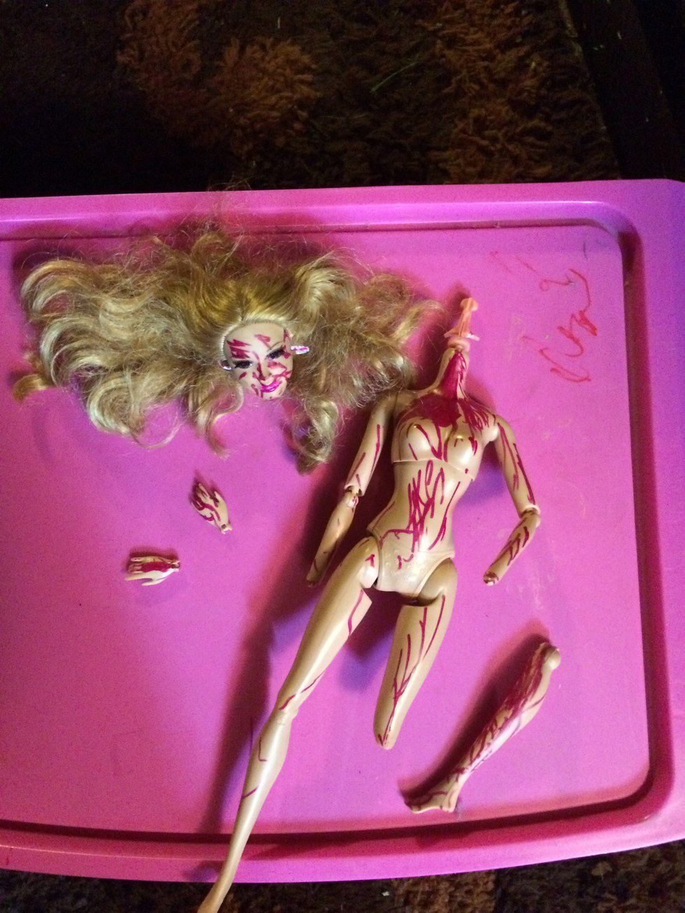 The picture is from my six-year-old. She was trying to create a ZOMBIE BARBIE. She did this all on her own, no prompting from anyone. She enjoys to watch "The Walking Dead" with her dad. She knows ZOMBIES are NOT real. She is very creative. She loves babies and asked me the other day if we could go to the baby store and buy one and how much money they cost. She wants to save all babies in the world who don't have moms and dads. She would like us to adopt more children who don't have families or a home or toys. She likes to do things to bring her art to life. Now her grandparents are unable to see her displays of art who both she gets to see (sparingly) just once a year, for two weeks over the summer months because I (respecting the wishes of others, and possibly at the cost of my job) took this picture down.