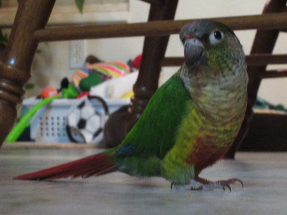 Green Cheek Conures, or, as many people call them, Green Cheeks, are from South America. They are the most common Conure in pet stores, because they are very colorful and have great personalities. They are probably the least expensive Conure available. My Green Cheek Conure was a rescue; he is about four or five years old. He had to be re-homed because he loved to scream whenever the baby of the house went down for a nap. Now, Green Cheeks are quieter than other Conures, but they still can be loud. They like to scream just as much as any other Conure, so keep that in mind if you are thinking about getting one! Ernie, my Green Cheek, loves to ring his bell during the night if I forget to take it out of the cage. He also isn’t very comfortable around little kids; honestly I think it comes down to the fact that they move very quickly and can be unpredictable. Maybe he had a bad experience with a kid, but I’ll never know for sure. Always supervise children’s interactions with birds! Never leave them alone together; it can be traumatizing for both of them.