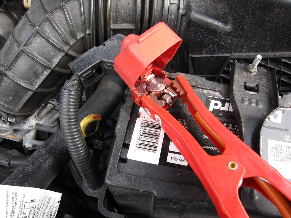 4. Attach one of the red clips to the positive terminal of your vehicles terminal