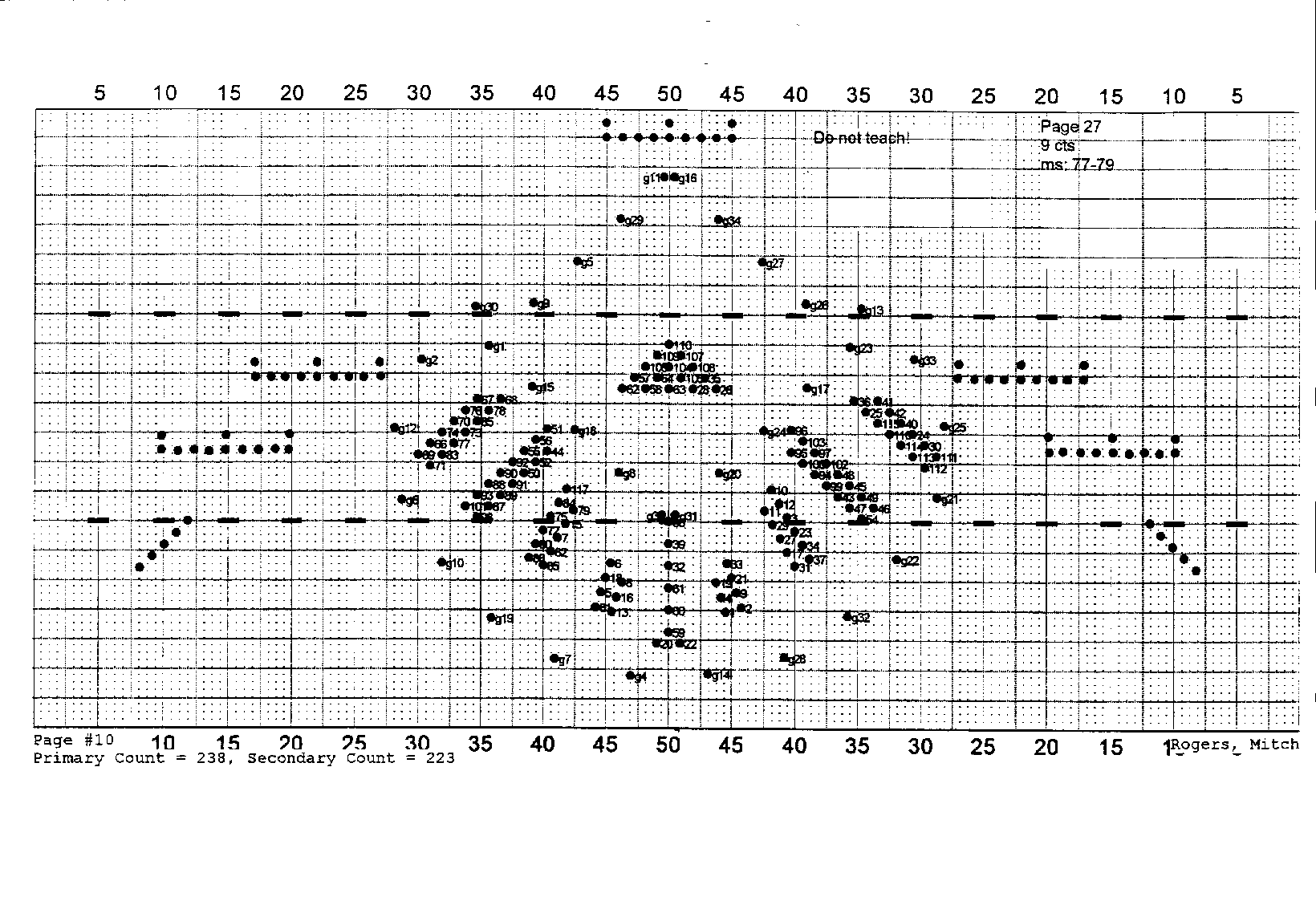 Here’s where the fun begins. For field shows, each band member is given a specific instrument number to follow on a drill chart, much like a coordinate on a grid. The student is responsible for tracking that instrument number throughout each chart in order to determine where to move to new formations. Flutes, for example, are F1-F19. Each new formation or hold during a formation is called a set. Depending on the length of a piece, there might be anywhere from 11 to 25 sets per song. Once the band is able to march through all the sets, you put it to music!