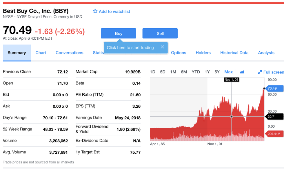 Yahoo Finance is a great resource because it is very simple and easy to use. It will give you the tools you need in order to invest. You should check it on a weekly basis at least. This will keep you updated on trends happening in the marketplace and which stocks to invest in. The most helpful tools are available to look at individual stocks, for this we will look at one stock for example; Best Buy.