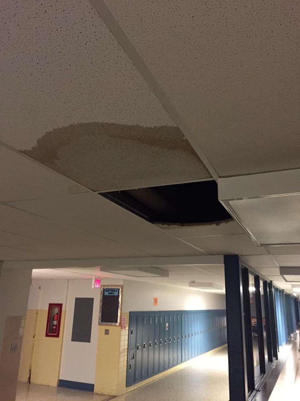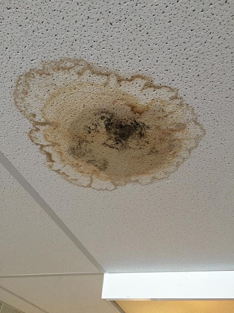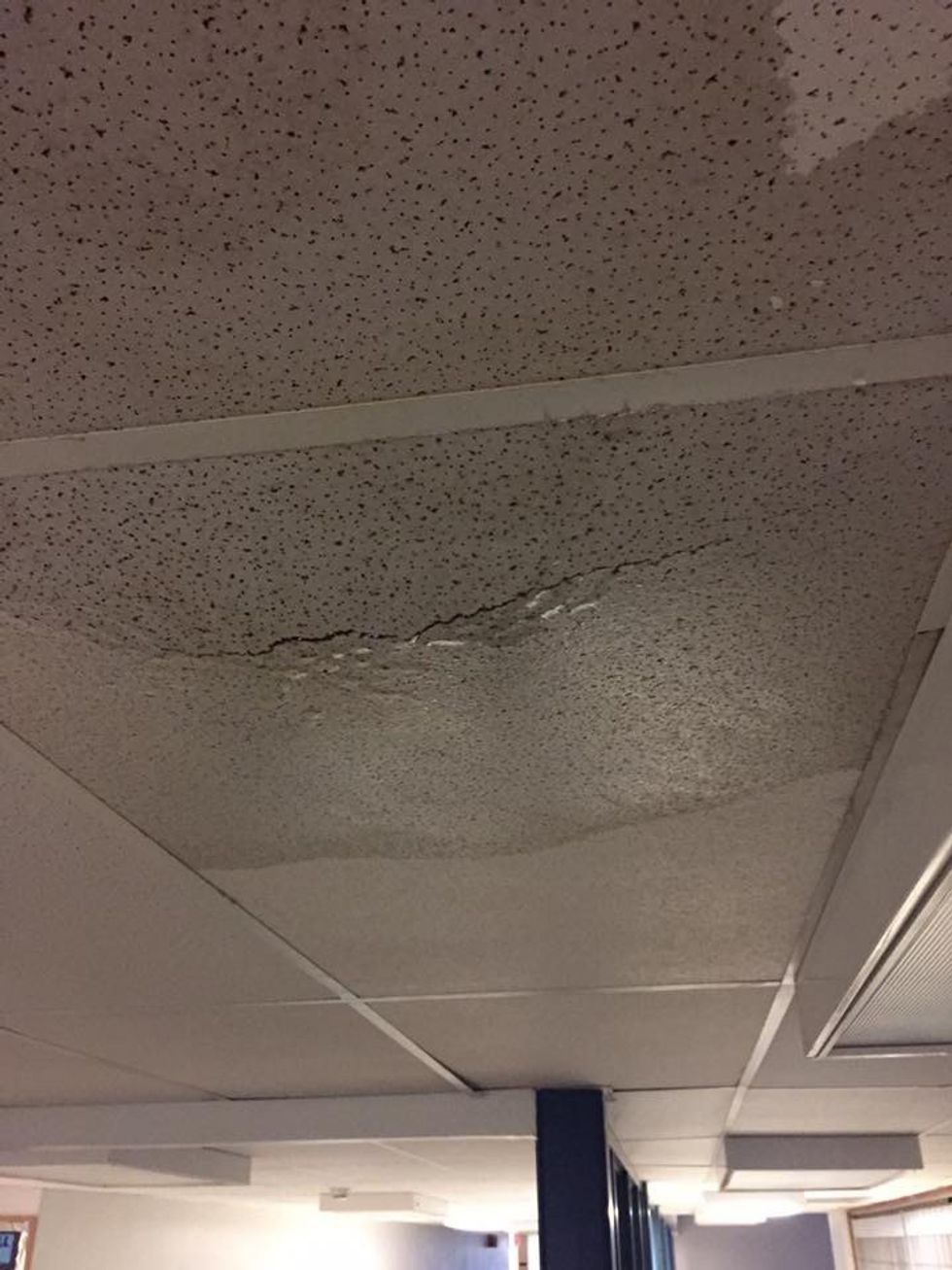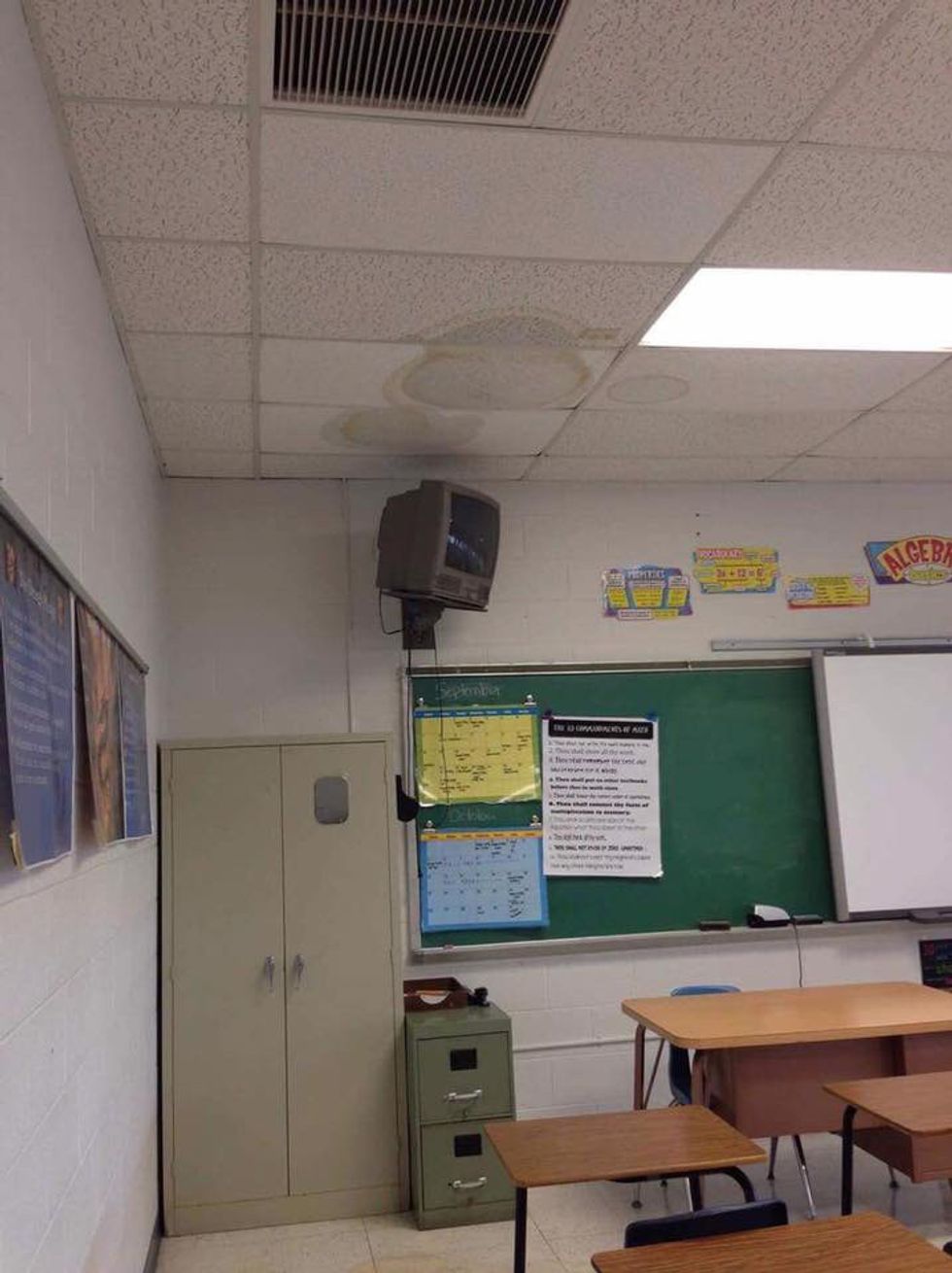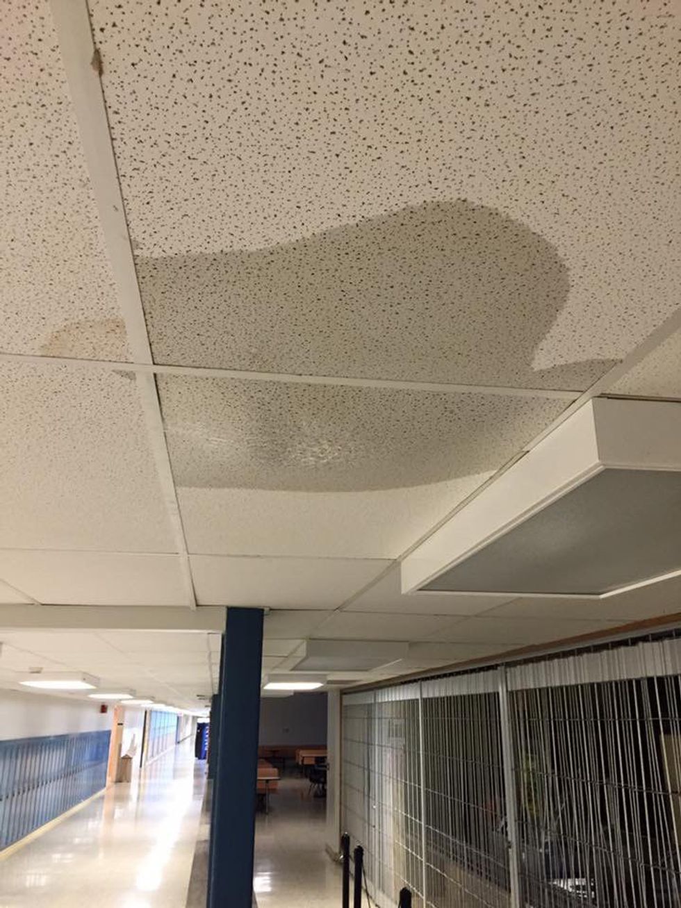 Every time it rains, trash cans have to be placed underneath this hole in the ceiling right where student's receive school lunch