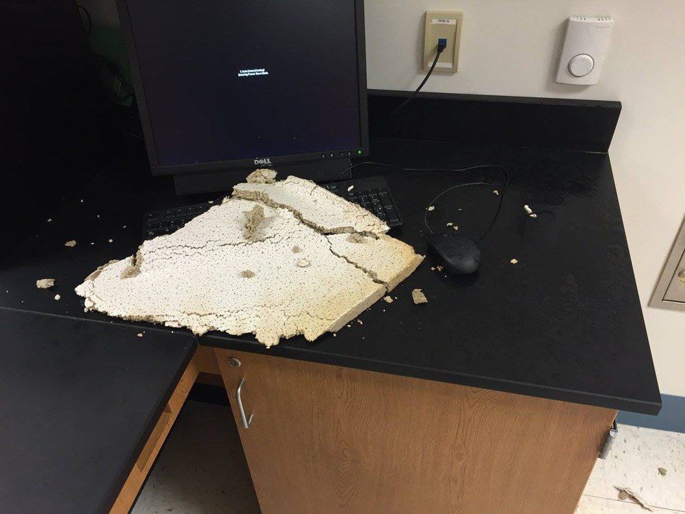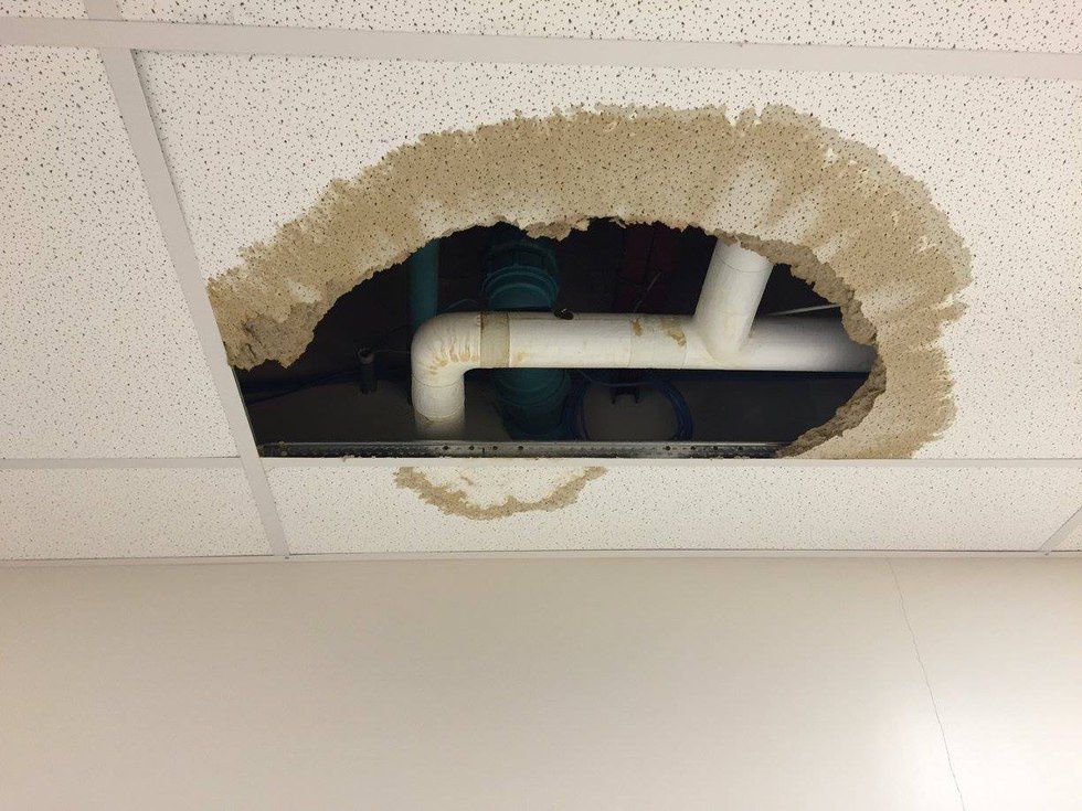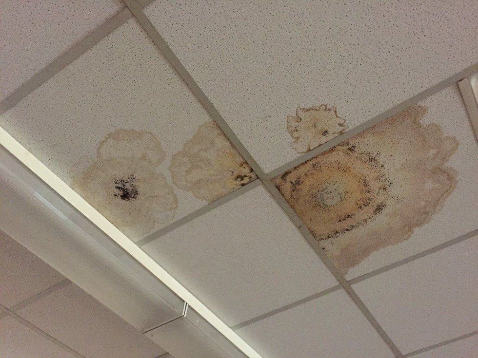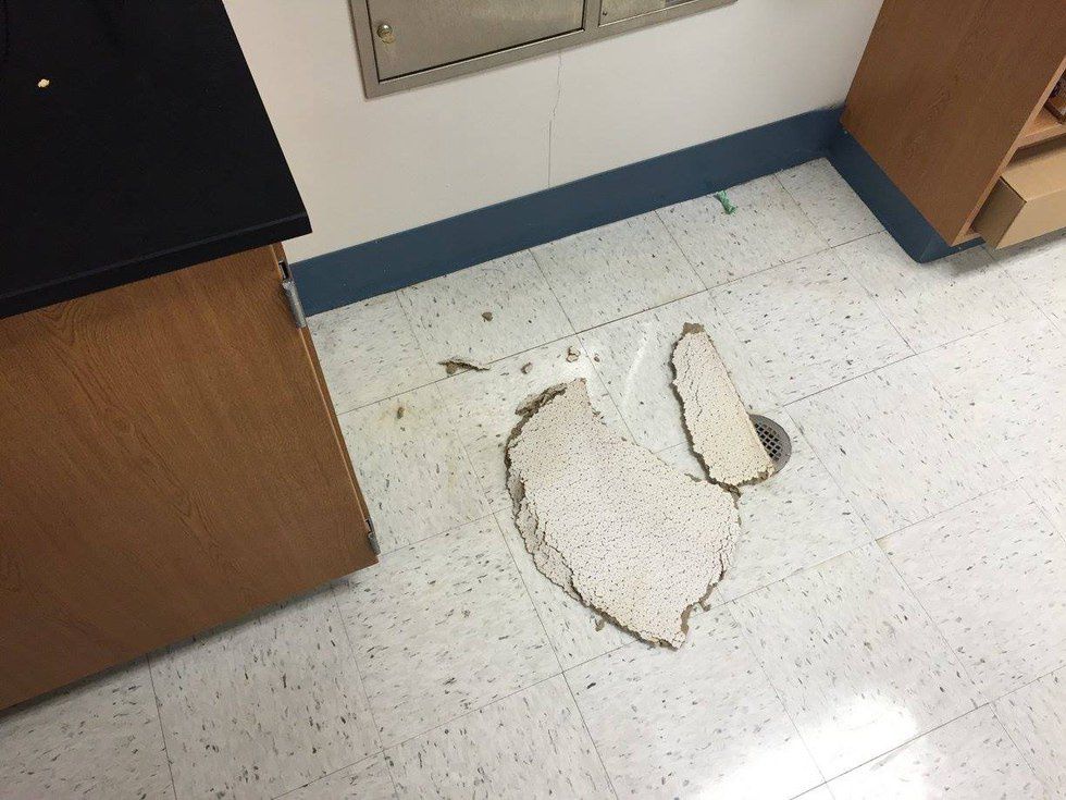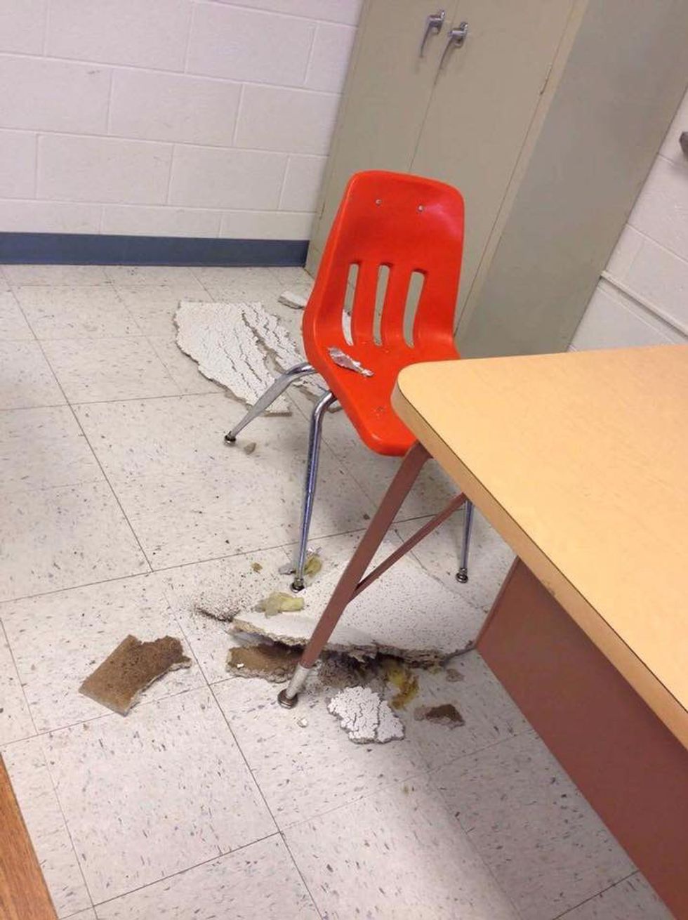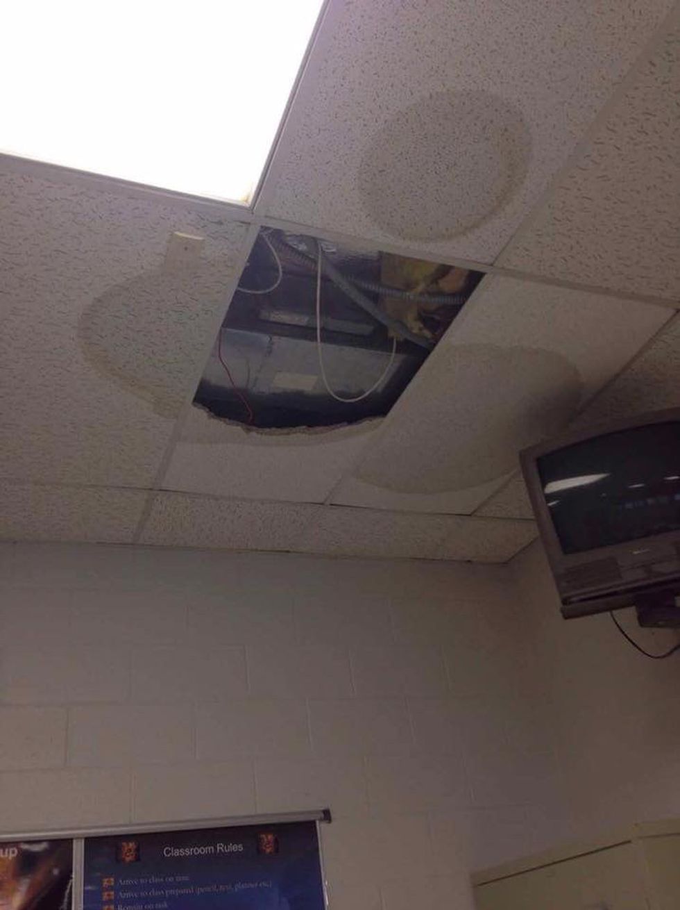 Every time it rains, trash cans have to be placed underneath this hole in the ceiling right where student's receive school lunch