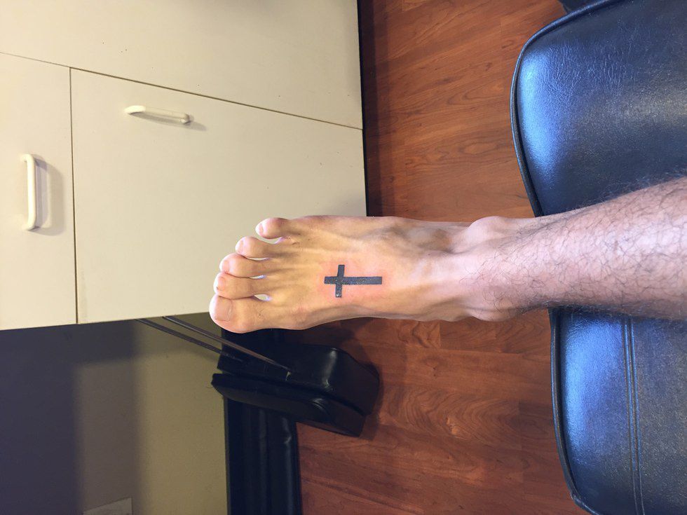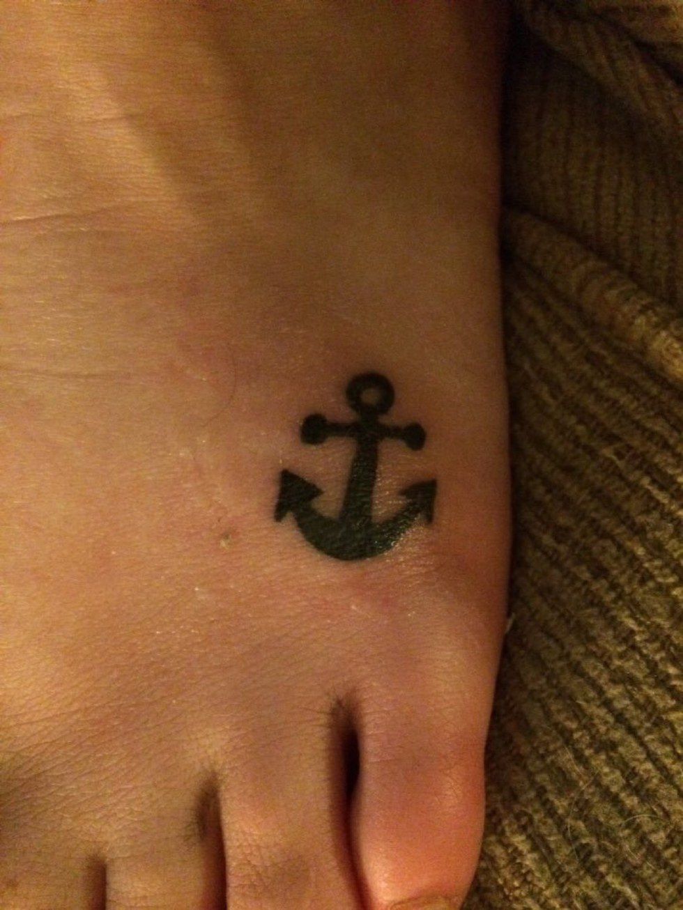 "My very first tattoo, I got this because I love anchors, and I also struggle with anxiety. So it's a reminder to keep my feet firmly on the ground at all times, no matter where my mind takes me."