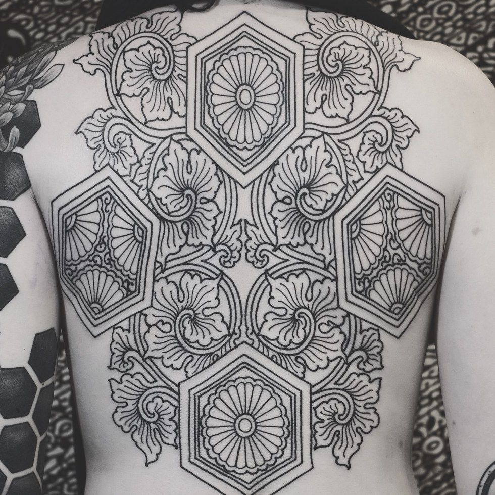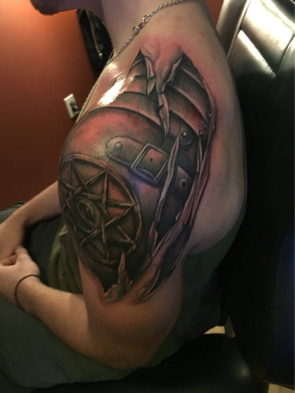 "The symbol was used in an anime to bind a soul to a suit of armor. My skin is my armor and my soul is bonded to it."