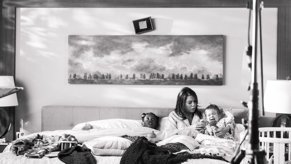 Regarding this photo Hinton remarks, "I remember on that day, the young boy [who plays Pompeo's son] would not stop crying. Everybody—from the kid's actual parents to Shonda [Rhimes] to one of the on-set nannies—did everything they could to try to calm him down. This is between shots and Ellen had to act as Mommy to get the kids to calm down."