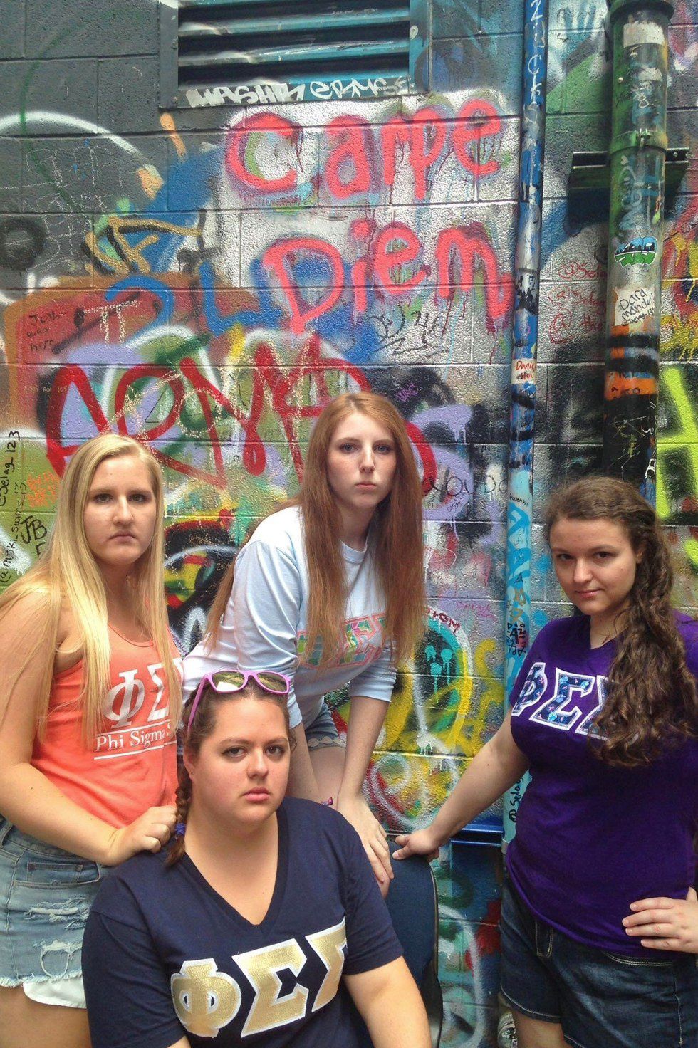 But that was just the tip of the iceberg. Our preparation started at the end of the preceding semester, when our recruitment theme--what we'd be dressing like and how we'd be designing our room--was announced. Weeks before anyone walked through our doors--and before most of us had any ideas about how it was all going to come together--we took some promo photos and filmed our recruitment video. We got really creative with some of these pictures, too. One of our sisters found some graffiti in an alley that was very awesome: