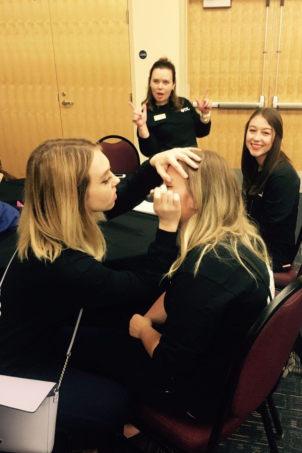 The week of actual formal recruitment reminded me more of Tech Week in theater than anything else, and if you've ever been through that, you know why it's affectionately referred to by players the world over as "Hell Week." It was insane. Every day, those of us who could be there came in three to four hours before rounds were set to begin to set up the room. Often, we did this in yoga pants. With our shoes off (the one difference from theater: too many screws loose on the stage to risk taking your shoes off there. Interpret that however you will). We dashed around the room, moving displays and setting up stands, all in various stages of preparedness for the evening: some of us would be in full makeup, but still in our everyday shirts and shorts. Some of us would have on a solid layer of foundation and maybe some blush, but only have our eye shadow partially finished, and be sporting only half of our "costume" for the evening (usually the pants so we wouldn't ruin our shirts hauling something in from someone's car). We'd even had a professional makeup artist come in and give us a makeup tutorial, but despite that, we still had the more makeup-savvy sisters of the group do makeup for those of us with less confident hands.