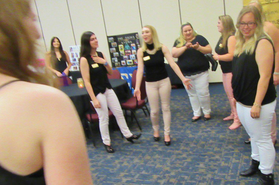 Moving further down the iceberg a bit, we had a recruitment retreat a few weeks later, in August. This retreat began bright and early with an outfit check: yes, we had to have our recruitment garb ready to go that long before we were actually going to need it (recruitment happens toward the end of September, for those of you who haven't seen my dozens of Facebook posts about it). That's how prepared we had to be. Good thing several of us were Girl Scouts. We did a lot of things at that retreat, most of which I'm probably not allowed to actually tell you because we had a professional speaker come in and inspire us to do them, but it lasted all day long, and not only did it get us extremely fired up for recruitment, it brought us all closer together.
