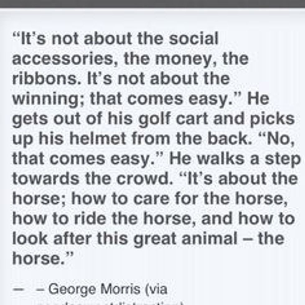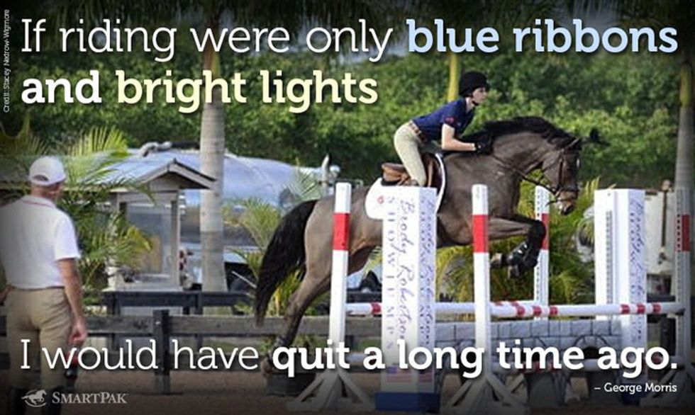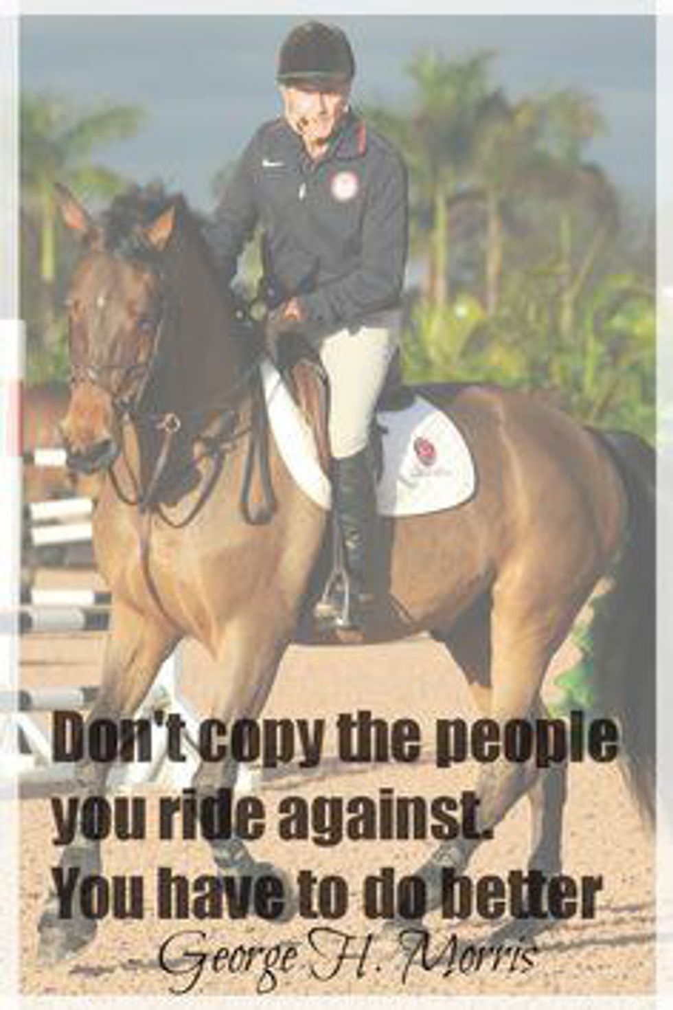 Not everything is winning or fame. That's not what life is. Life is a learning experience about making yourself the best you can be. Recently I got a 6th place at a show, and honestly I was extremely surprised. I felt as though it had been my best ride ever. It felt pure and borderline perfect. But when I dismounted and heard my placing I accepted it, walked over to my coach, discussed my ride, and decided that it was one of my best rides. So, the judge placed me at 6th; who cares? I was extremely proud of my ride. No, my ribbon wasn't blue, but I learned a lot about myself on that ride, I was confident and I felt free. That's what riding is, and that's what life is. It's about a connection and only improving yourself.