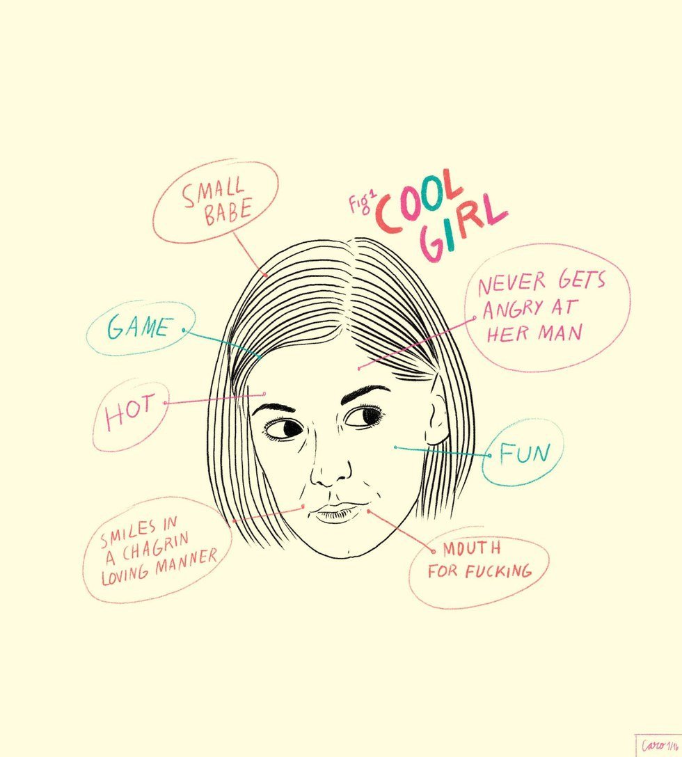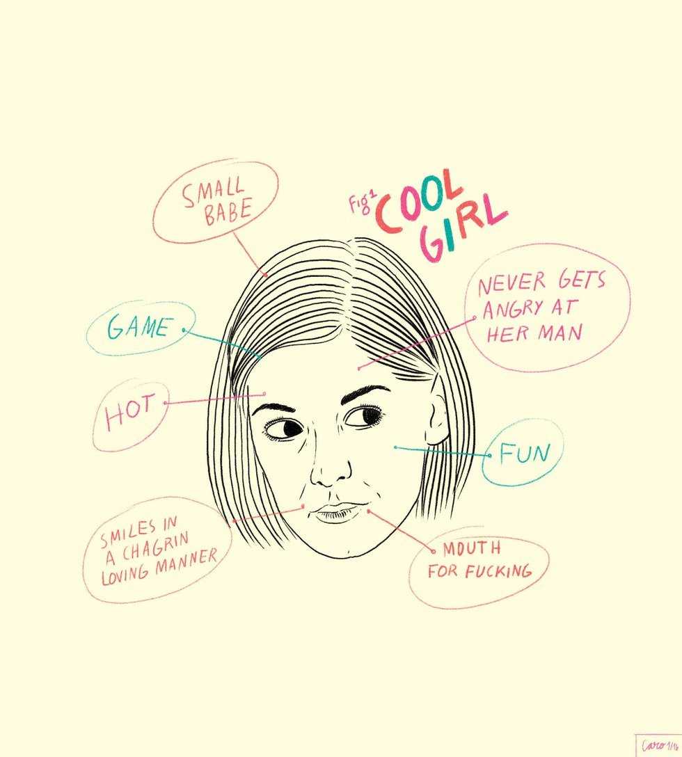 "Men always say that as the defining compliment, don't they? She's a cool girl. Being the Cool Girl means that I am a hot, brilliant, funny woman who adores football, poker, dirty jokes, burping, who plays video games, drinks cheap beer, loves threesomes and anal sex, and jams hot dogs and hamburgers into her mouth like she's hosting the world's biggest culinary gang bang while somehow maintaining a size 2, because Cool Girls are above all - hot. Hot and understanding. Cool Girls never get angry; they only smile in a chagrined, loving manner and let their men do whatever they want. Go ahead, shit on me, I don't mind, I'm the Cool Girl."