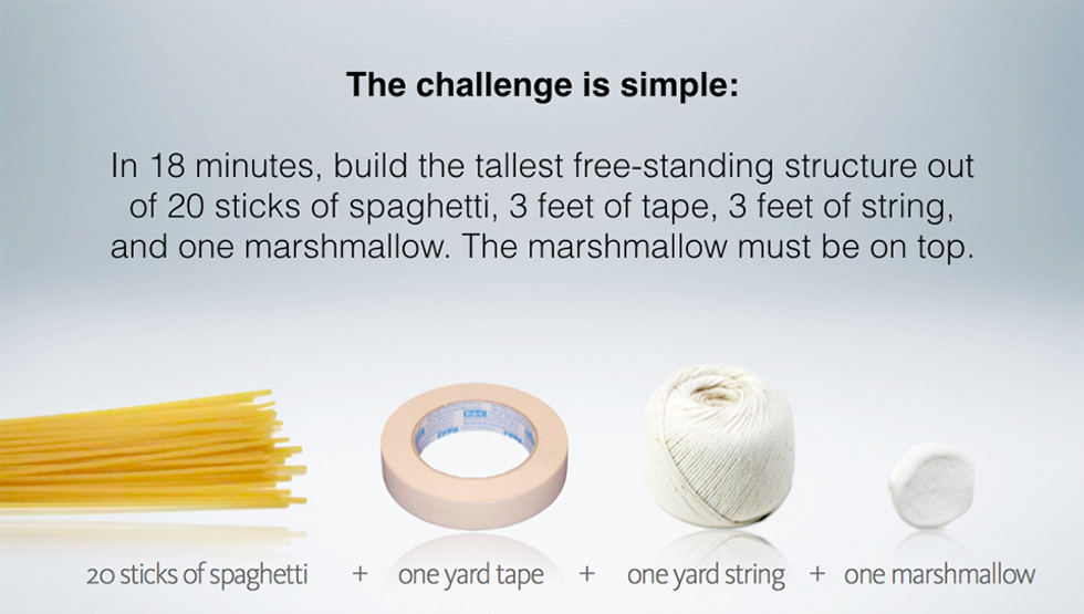 The Marshmallow Challenge was originally designed by Peter Skillman from TED. Kindergartners are open to many possibilities and often have the most creative and tallest products. According to Skillman, the worst performing group of people consisted of business graduates, who are often trained to complete tasks only one way. As we grow older, we lose imagination and creativity because the adult world tells us that there is only one right way to do things. But there is no one right way! "Look for a new angle," as said by Tadashi Hamada from the Disney movie, "Big Hero 6."