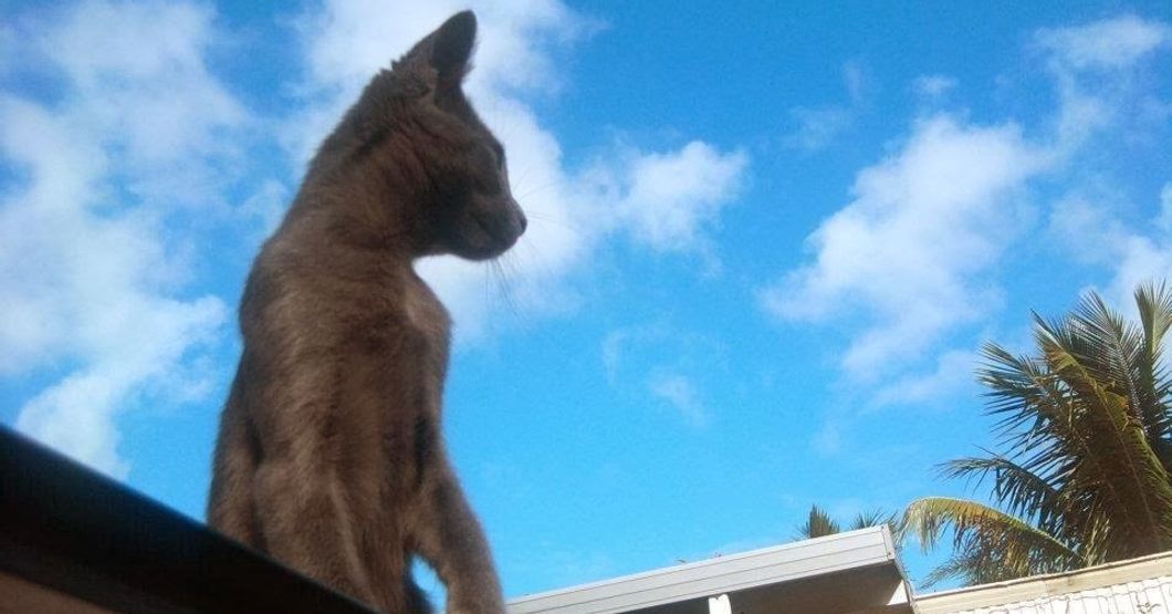 Smoky the cat checking out a bird flying by the sunroof of the Beemer