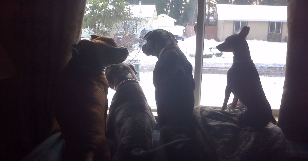 Four dogs, with Ruger, her dad and Athena in the middle, watching snow get shoveled