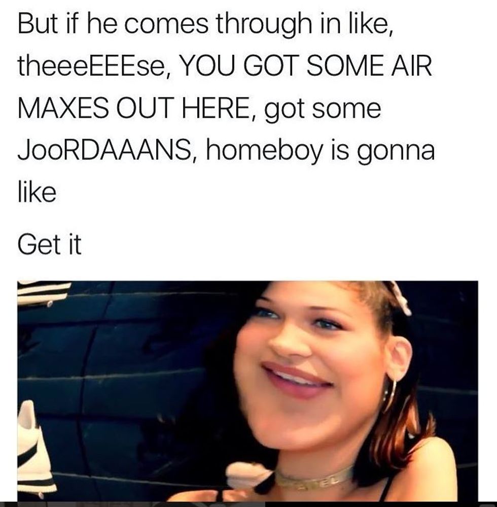 “If homeboy’s coming through with these [sneakers], things are quiet. Yeah, no, it's quiet for him. But like if he comes through with like THESE [Air Maxes, Jordans] . . . homeboy’s gonna, like... get it.” Hadid coyly cocked her head with a flirtatious glimmer in her eyes.