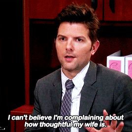 To give more background to this scene, Ann comes in to talk to Ben about what to get Leslie for a gift. They keep talking saying they have no idea what to get her because she's the best gift giver in the world. He then proceeds to complain about the wonderful presents that she gives him and how he can never compare. I love it because he cherishes Leslie and thinks he can never do enough.