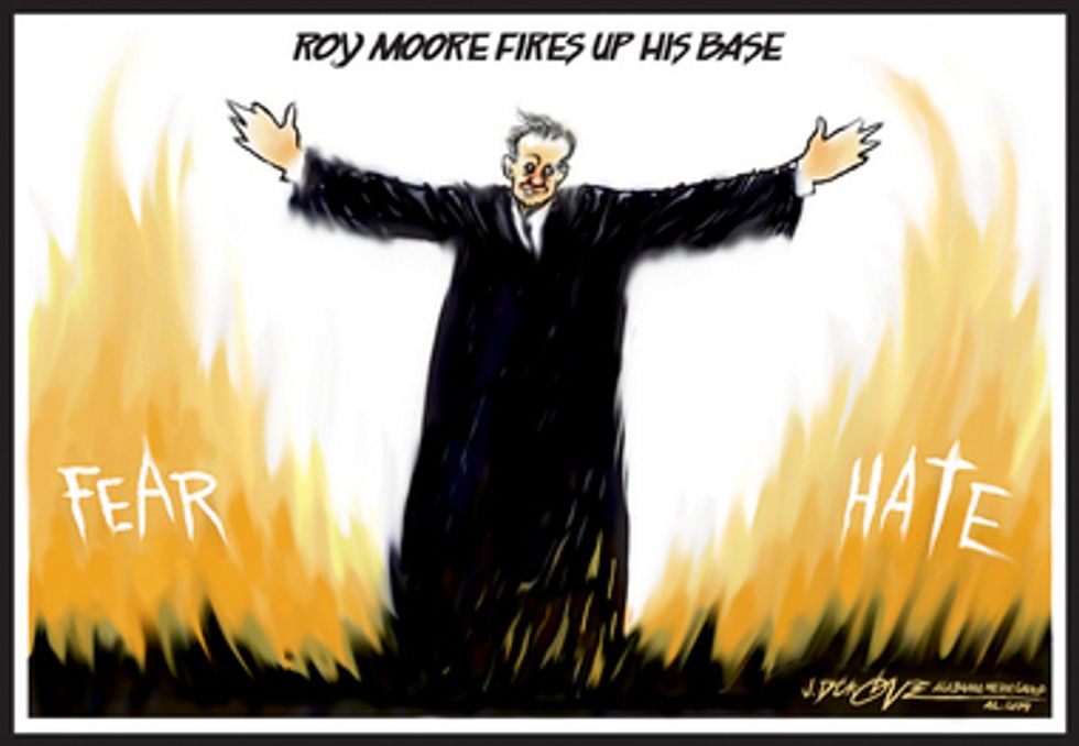 Moore is a strong voice for the Republican right, opposing abortion, marriage equality, and civil liberties while upholding a thoroughly Christian perspective. His religious dogma makes him a dangerous voice for Evangelical groups. Moore continues to hold these beliefs closely to his heart, believing that the constitution and God's will are one in the same. God, he says, governs all.