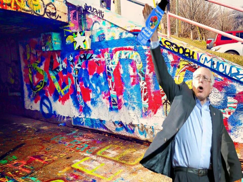 Next he would stroll on through the tunnel of free expression because he's all about exercising that first amendment. Then he might shamelessly plug himself...#feelthebern