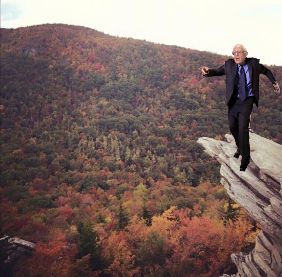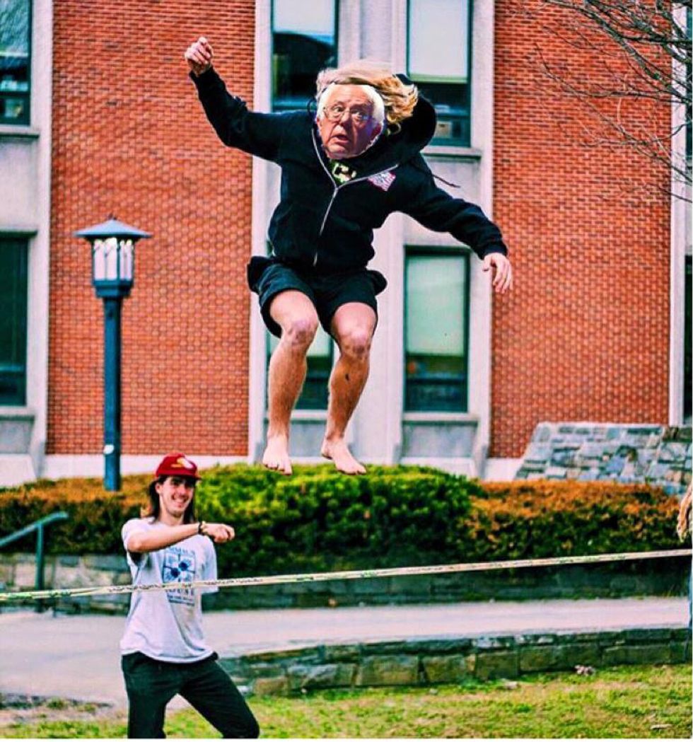 What's this? Bernie can slack line too? He would perfectly execute the line as if he was a slackliner in his own college days at the University of Chicago. The slackliners would be impressed and promise Bernie their vote.