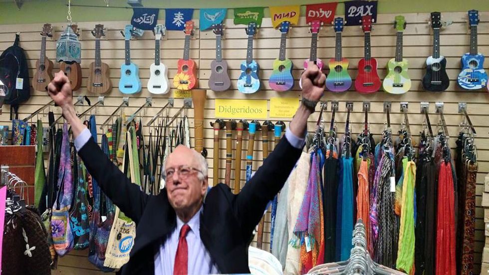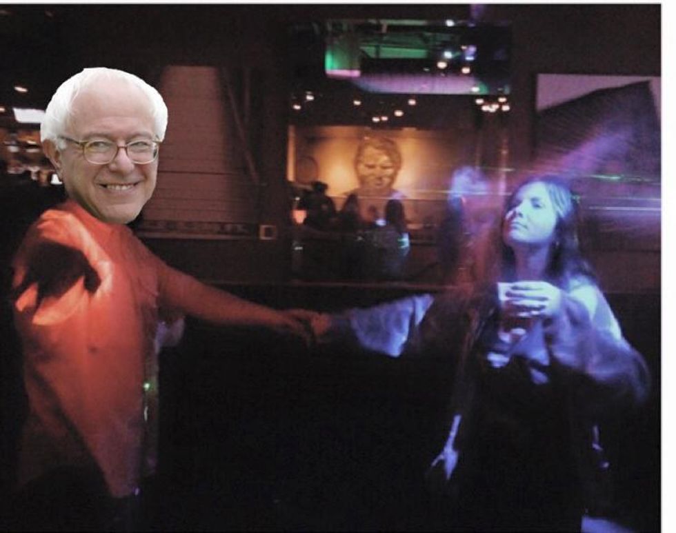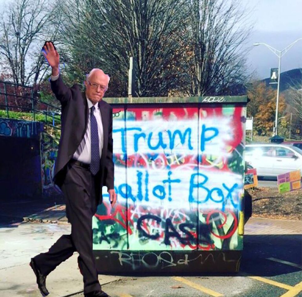 Bernie probably would have heard of the infamous Trump Ballot Box by now, so he would take off to find it. He finds it, and it is everything and more that he could have imagined. He would take a picture with the trump ballot box and upload it to his Facebook page -- caption: I love this town.