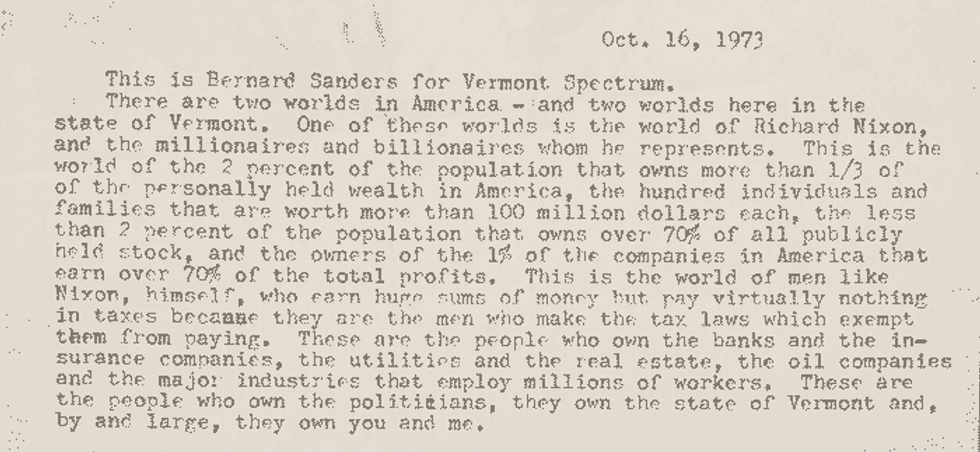 Lucky for us, this story doesn’t end like most—“Bernie Sanders became a crooked old congressman and died a very rich man”—No, Bernie is still out there pushing the same issues he has been for 40 years. For 40 years, he has been shouting warnings about income and wealth inequality, what the collapse of the middle class means for our country. While the rich continue to get richer, real unemployment which is at 11 percent is dangerously high, millions of Americans still lack health insurance, and more families are living in poverty than at almost any time in the modern history of our country. His campaign page warns, “Our inequality is worse now than at any other time in American history since the 1920s. Today, the top one-tenth of 1 percent of our nation owns almost as much wealth as the bottom 90 percent combined.” For years, Bernie has fought tirelessly against trade agreements that have shut down over 60,000 factories in this country, finding cheaper ways for large international corporations to make their product while 4.9 million Americans are left out of work. Most recently, he has started a petition against the Tran-Pacific Partnership. “During my 23 years in congress, I helped lead the fight against NAFTA and PNTR with China. During the coming sessions of Congress, I will be working with organized labor, environmentalists, religious organizations, Democrats, and republicans against the secretive TPP trade deal.” You can help fight this disaster by clicking here to sign Sander’s petition. (Click here to see what else Bernie is already doing to prevent the collapse of our middle class)
