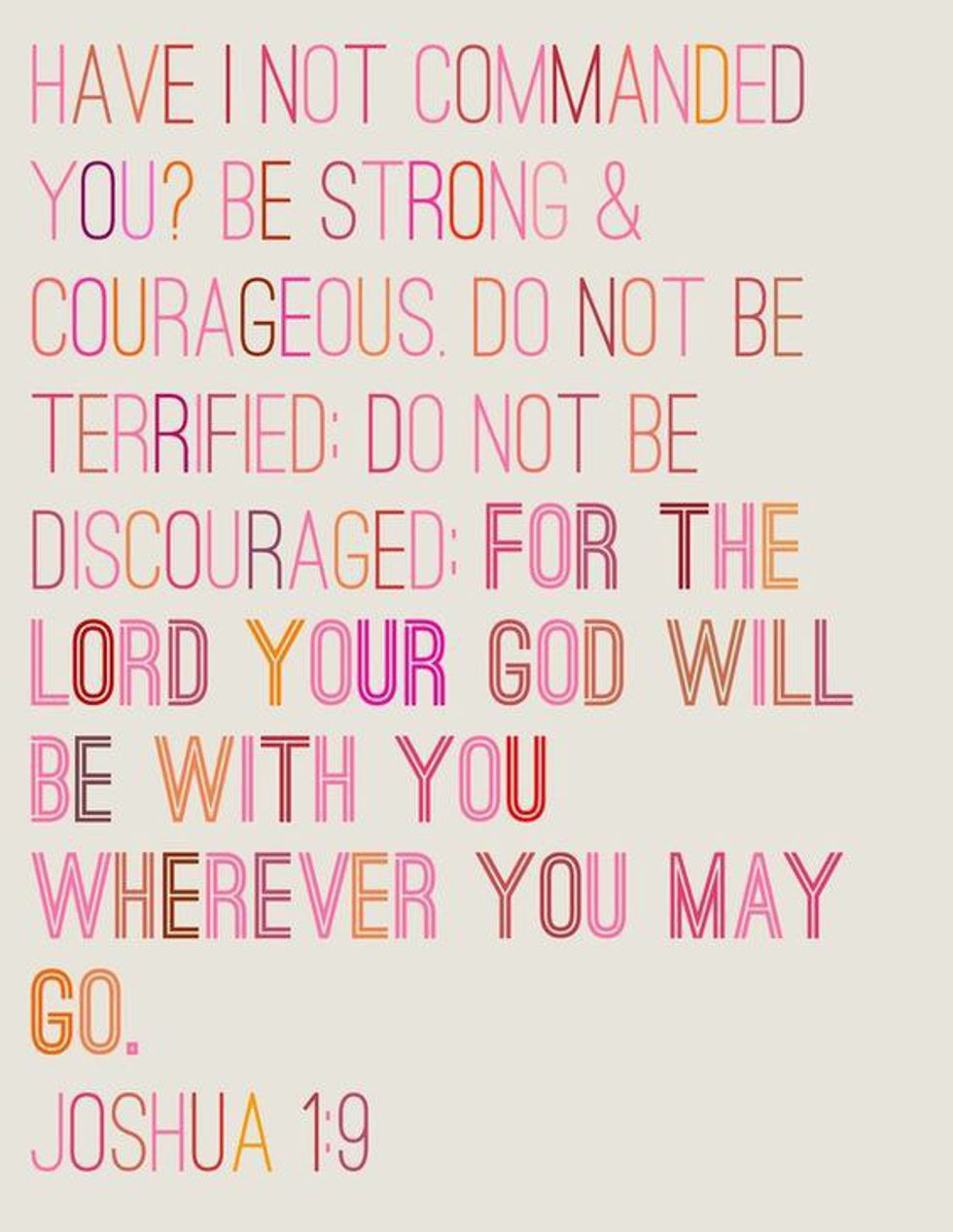 Similar to the classic, "Even though I walk through the valley of the shadow of death, I do not fear for you are with me" (Psalm 23:4), Joshua 1:9 deals again with the theme that pops up a lot of this collection of verses: fear. The reminder that God is constantly at our side is a lesson one needs to hear daily if one is to even get out of bed in the morning. The world is a extremely frightening place and the fact that God is there to walk through it with you, lending a hand, is sometimes the only consolation one can have. It also reminds us to be strong—strong against sin and strong against our battle with fear. We are deigned to be Luke Skywalkers of our own lives, battling our individual Darth Vaders. Fighting evil is scary when not a movie character but we are called upon to do it each day. We just need to have courage.