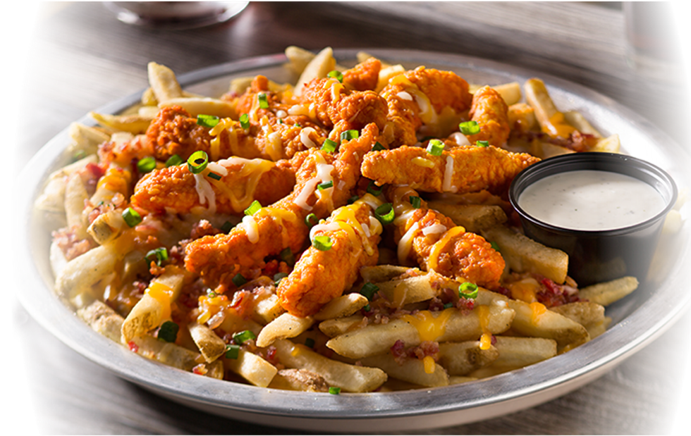 ZINGERS® piled over crispy fries, smothered with melted Monterey Jack and cheddar cheese, bacon bits and green onions, with you’re a side of ranch dressing or bleu cheese, all for the price of $11.59.