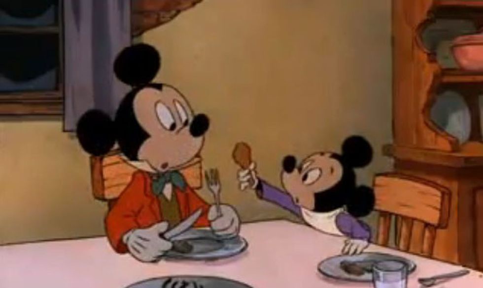 When Mickey gave up his harmonica to buy Minnie a chain for her watch but she gave it up for a case for his harmonica. She says "Oh, Mickey! I can't believe you gave up what means the most to you for me." Mickey the hopeless romantic that he is responds with "Oh, Minnie. You're all the music I'll ever need."
