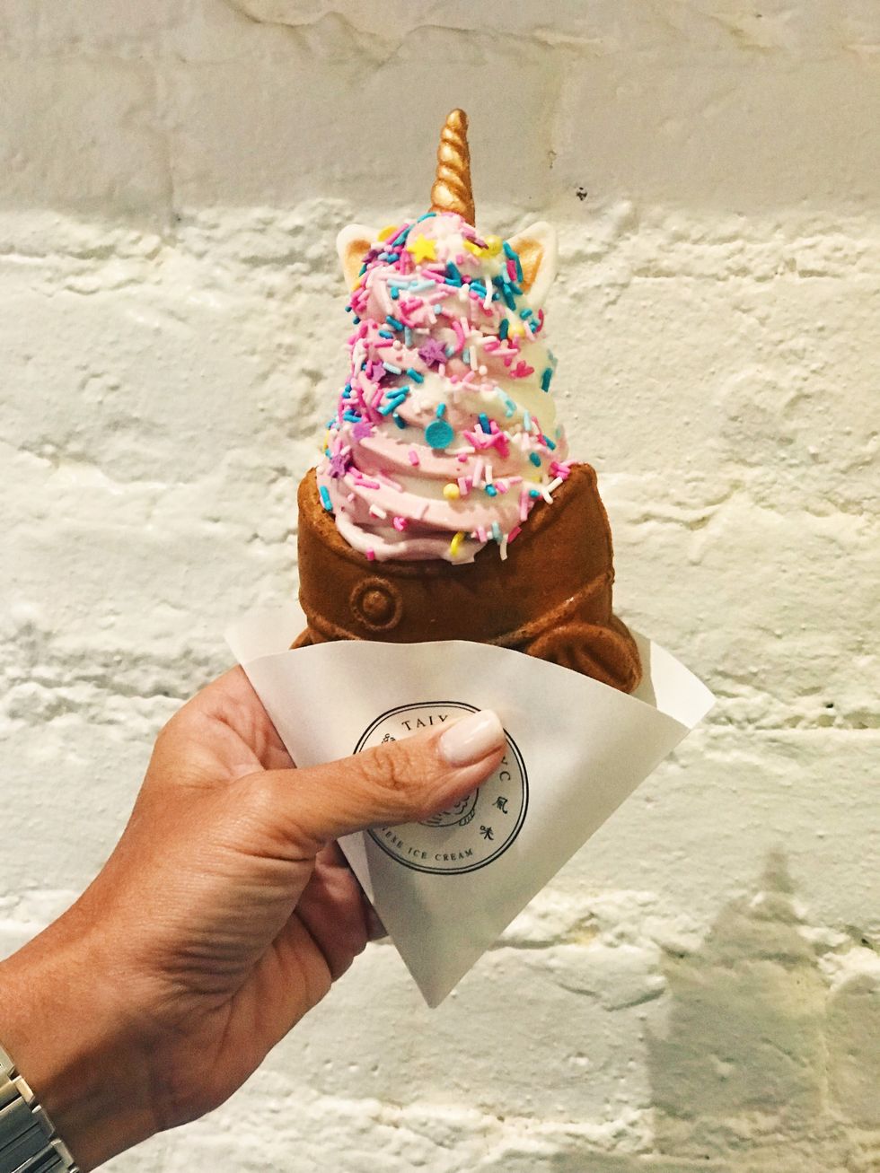 Not only are these ice cream cones incredibly cute but also they come in unique and delicious flavors that you probably haven't tried. The fish-shaped waffle cones are filled with either custard or red bean and topped off with a perfect swirl and their signature unicorn horn and ears.