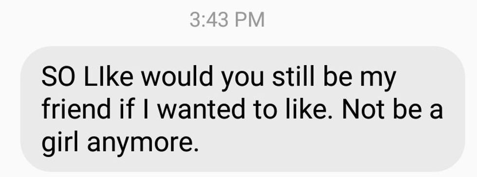 I love my best friend. He is a wonderful human being, and while he wasn't born a male, he is still my friend. He is still someone's offspring, and someone's sibling. He just wishes to be a man, and I know I will love this person just as much as the last, because he's still the same person. He's just a dude.