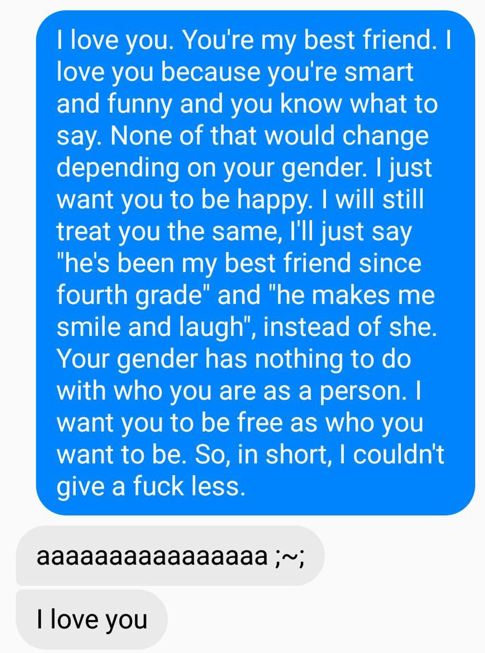 In short, my best friend, the person I told stories to, and shared a bed with, and giggled with, and had genuine memories with, is not gone. He is still here. He will forevermore be known to me as male. If I can look at someone I've known for 10 years, and say "You're a male now. Your preferred pronouns are he, him, and his", and accept it. Then, why do others have so many issues with it? Why can't we love people for who they want to be? And why do we have to put so many people down for wanting to be happy?