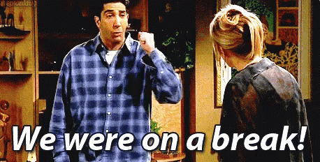 The whole team rachel, team ross debate still goes on to this day people... This is the most legendary out of all running jokes in my opinion. It was such a huge moment in the show when Ross decided to cheat and break Rachel's heart (you can tell who's side I'm on), and this line just became SUCH a big part of popular culture. This gif isn't from the first scene but you get the gist, Ross says this... a lot.