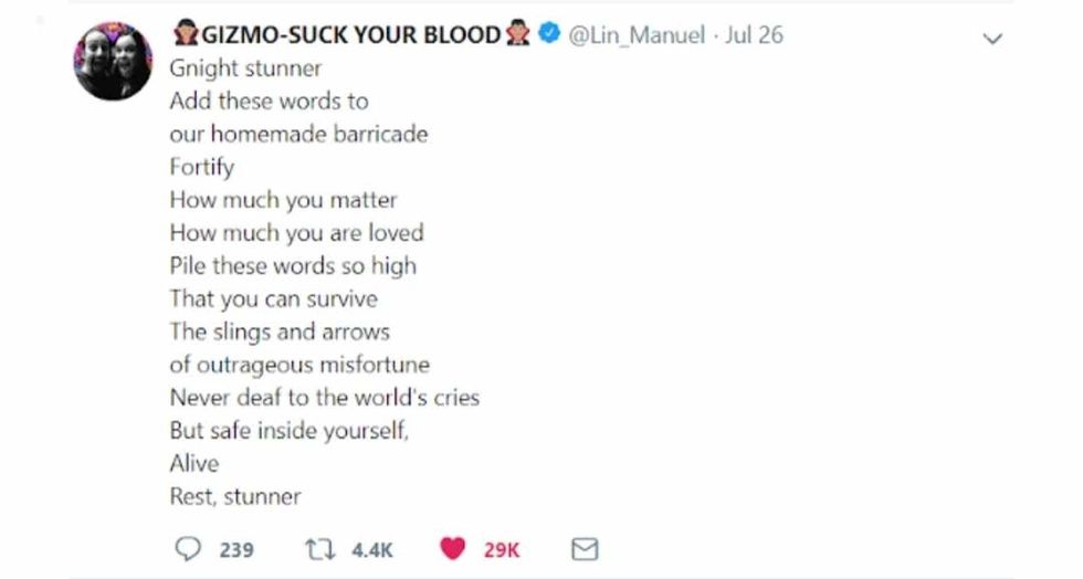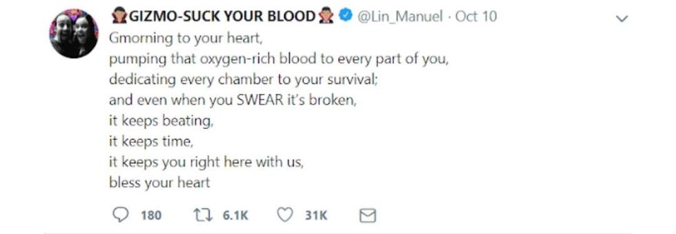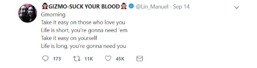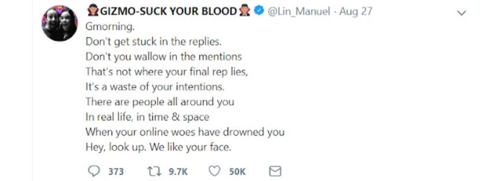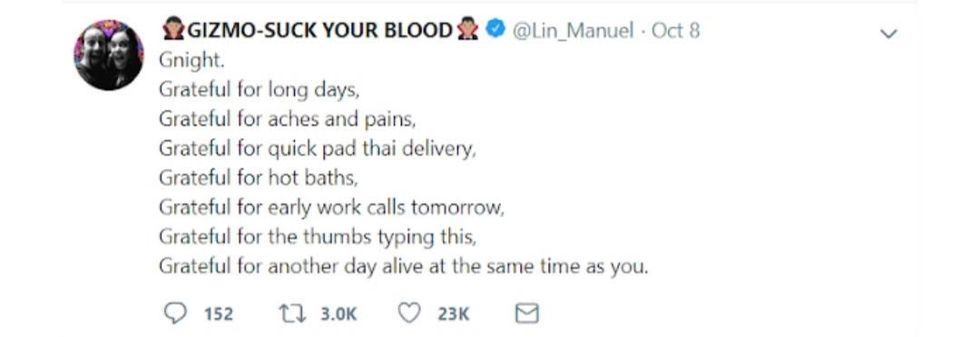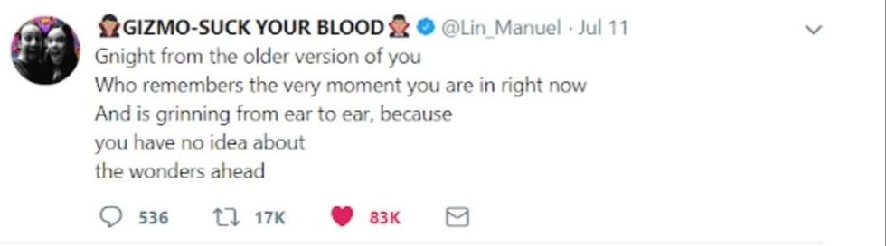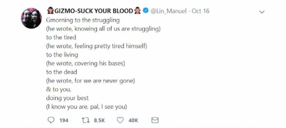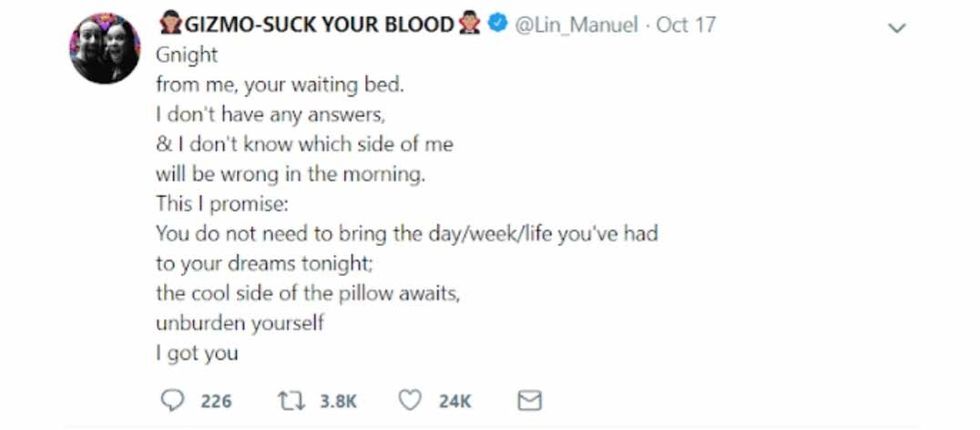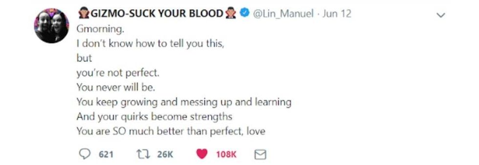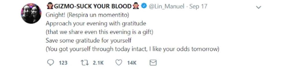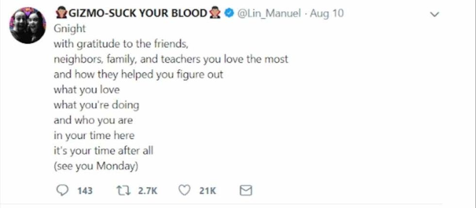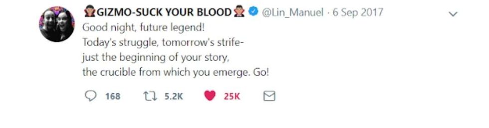 Whenever I am not having a great day, or something goes wrong in the world, I always know that a glimpse at Lin-Manuel's Twitter page can brighten up my day. His tweets are incredibly inspiring, motivational, and just a great reminder that kind people still exist in the sometimes hostile world we live in today.