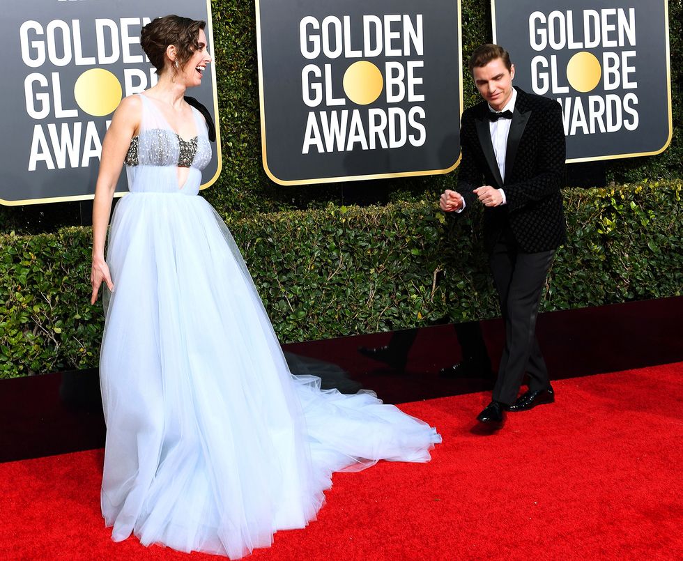 Brie and husband, Dave Franco, arrived in style with Brie wearing a stunning Vera Wang gown with a sparkly bra to accent. Peep the happy couple above after Franco saves his wife from a near wardrobe malfunction.