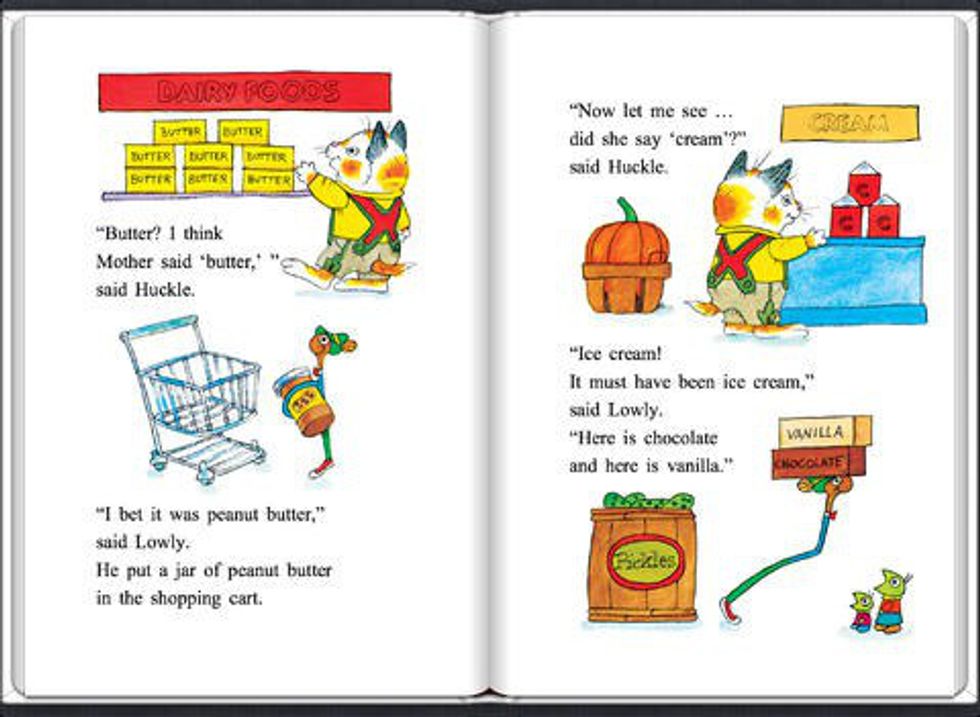 If you're not familiar with the book, the story follows the misadventure of Huckle Cat. His mother sends him to the store with a list of essentials, but once there, he realizes he forgot the list. He relies on his memory, but misconstrues the specifics of each item: