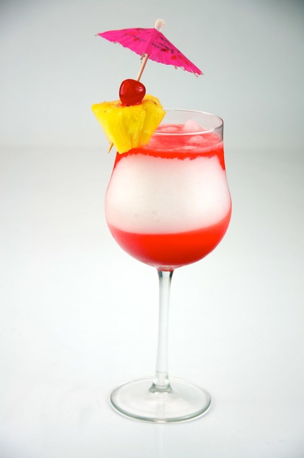 Light AND dark rum, passion fruit juice, orange juice, lime juice, and a cherry to top it off.