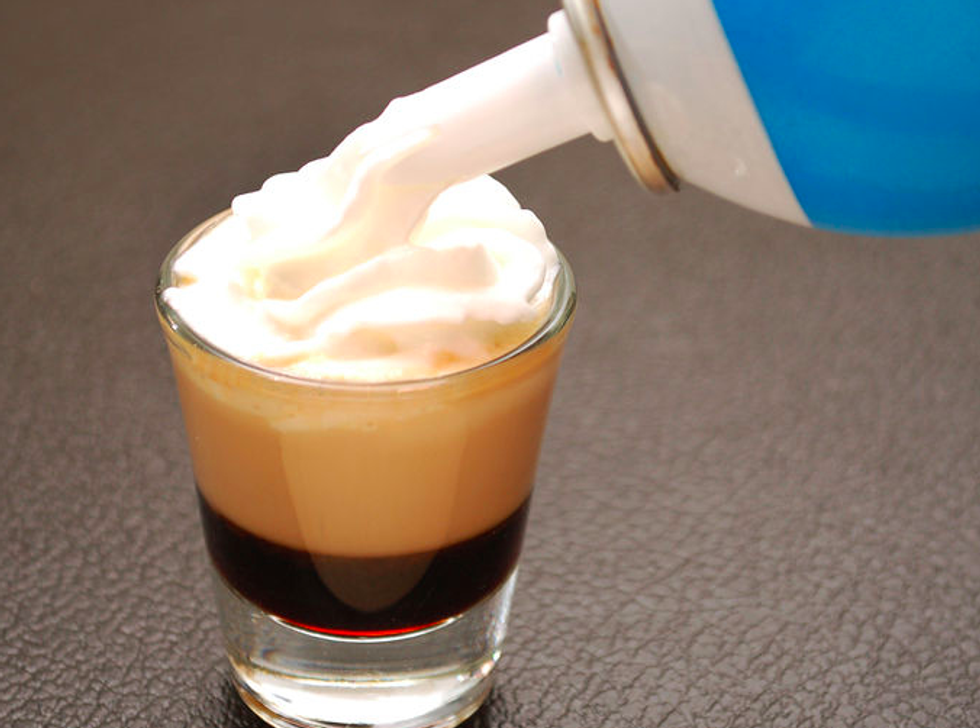 Irish cream, coffee liqueur, SMALL amount of vodka (on top of liqueur), with whipped cream.