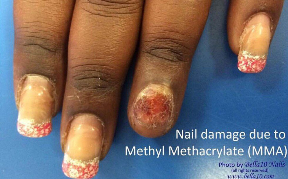 History: MMA Methyl Methacrylate is made to create advertising signs, skylights, building panels, enamel resins, etc (EPA, 1999). MMA is a dental acrylic not a cosmetic acrylic; it originated in the dental industry for making crown bridges (OSHA, 1997). MMA is not recommended to use on our nails, simply because it gets way to hard and can easily tear the your nail off. Yeah, I didn't know that either, and it's like who cares when your just trying to slay, right? Wrong! I didn't know simply because it's not like there's signs with informational facts in nail salons other than the nail price list.