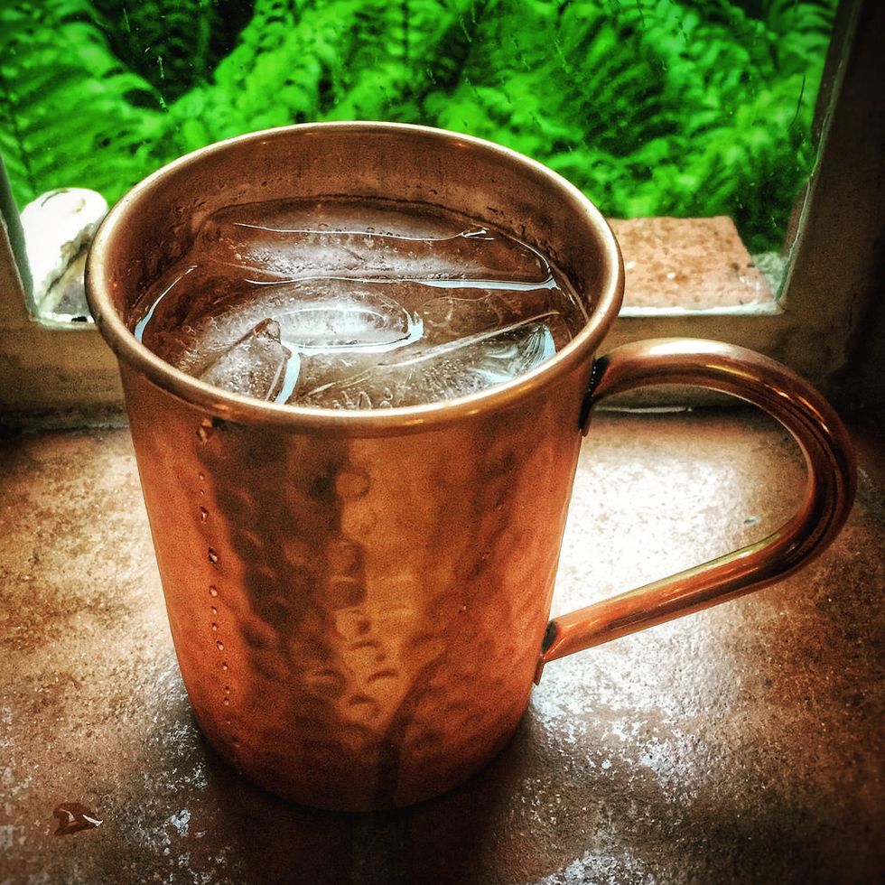 How can a drink in a copper mug not be served outside? It makes your outfit look cuter and matches the aesthetic of fire, snow, trees, sun or really anything outdoorsy. Vodka, Lime, and ginger beer have never tasted so amazing with copper keeping this drink cold.