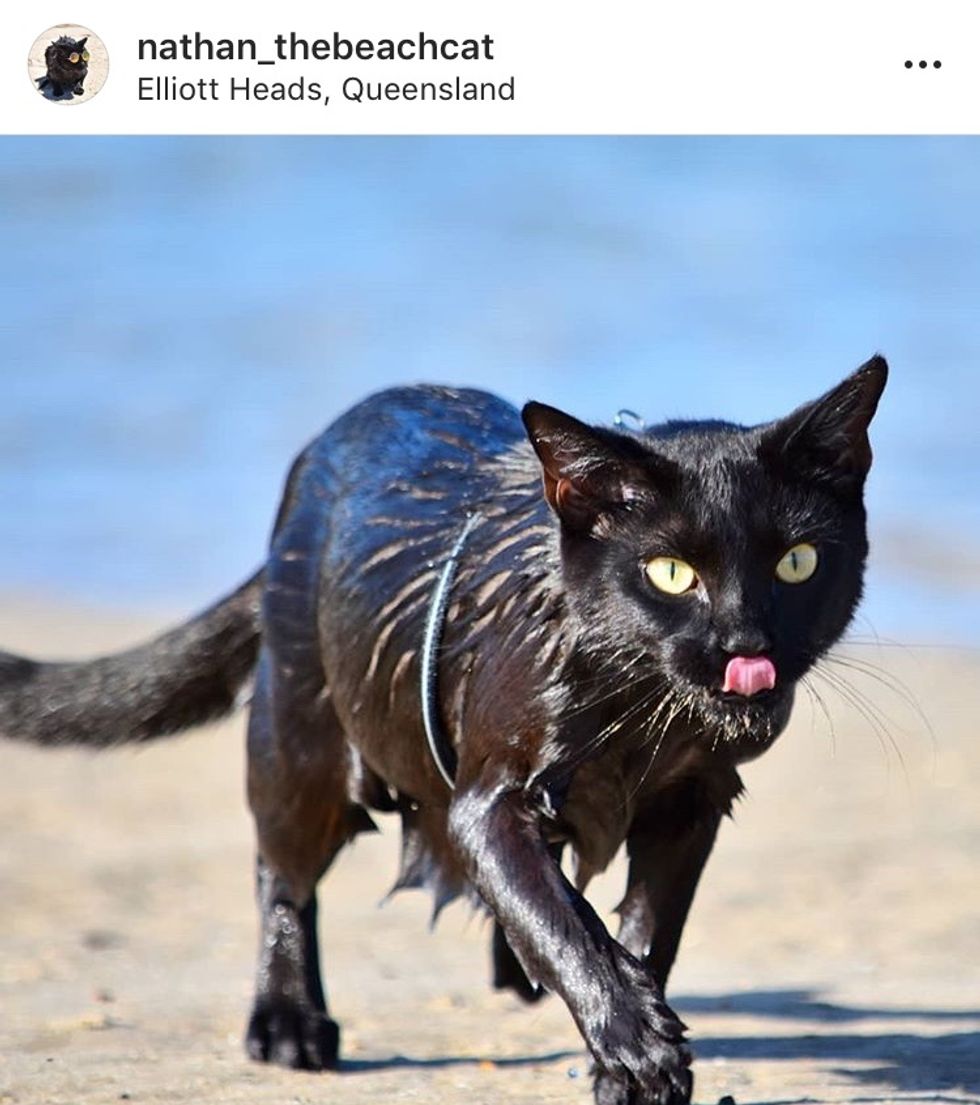 Nathan is so much fun! He's a black cat from Queensland, Australia who loves to go to the beach with his dad! You can catch him on Instagram boogie-boarding, sun-bathing, and swimming the days away.