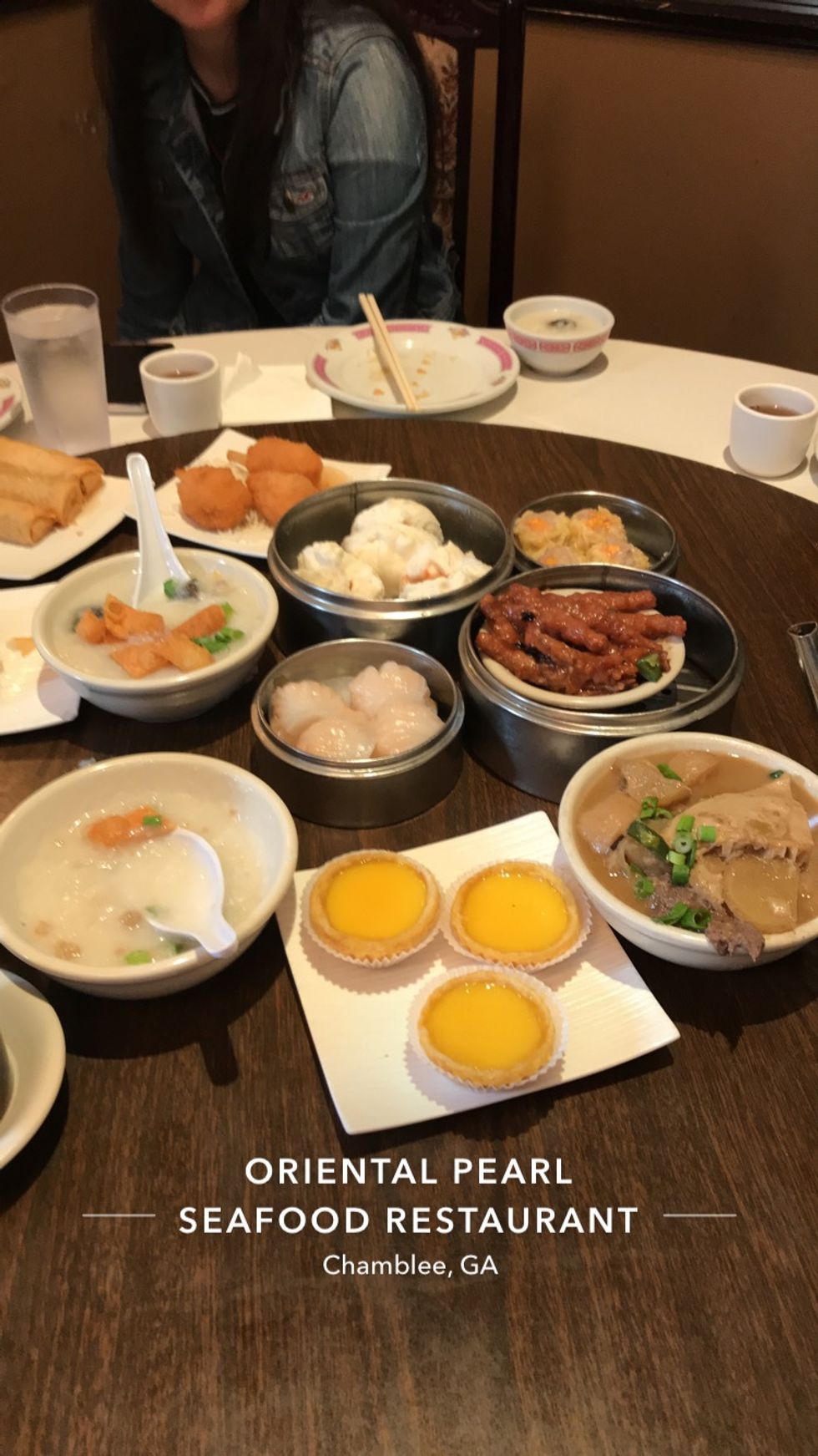 One of my all-time favorite dim sum restaurants is Oriental Pearl Seafood restaurant. This place can be packed on weekend but it is so worth the wait. My friends and I were overwhelmed by the different dishes offered on the dozens of carts. We were so full that we had to take some of the dishes home. We had the opportunity to taste shrimp dumplings, pork siu mai, steamed pork buns, spring rolls, Chinese donut noodle rolls, egg tarts, and fried sesame balls. This is such a great way to catch up with friends for weekend brunch. In the picture, there are egg tarts, congee, shrimp dumplings, chicken feet, spring rolls, and pork siu mai.
