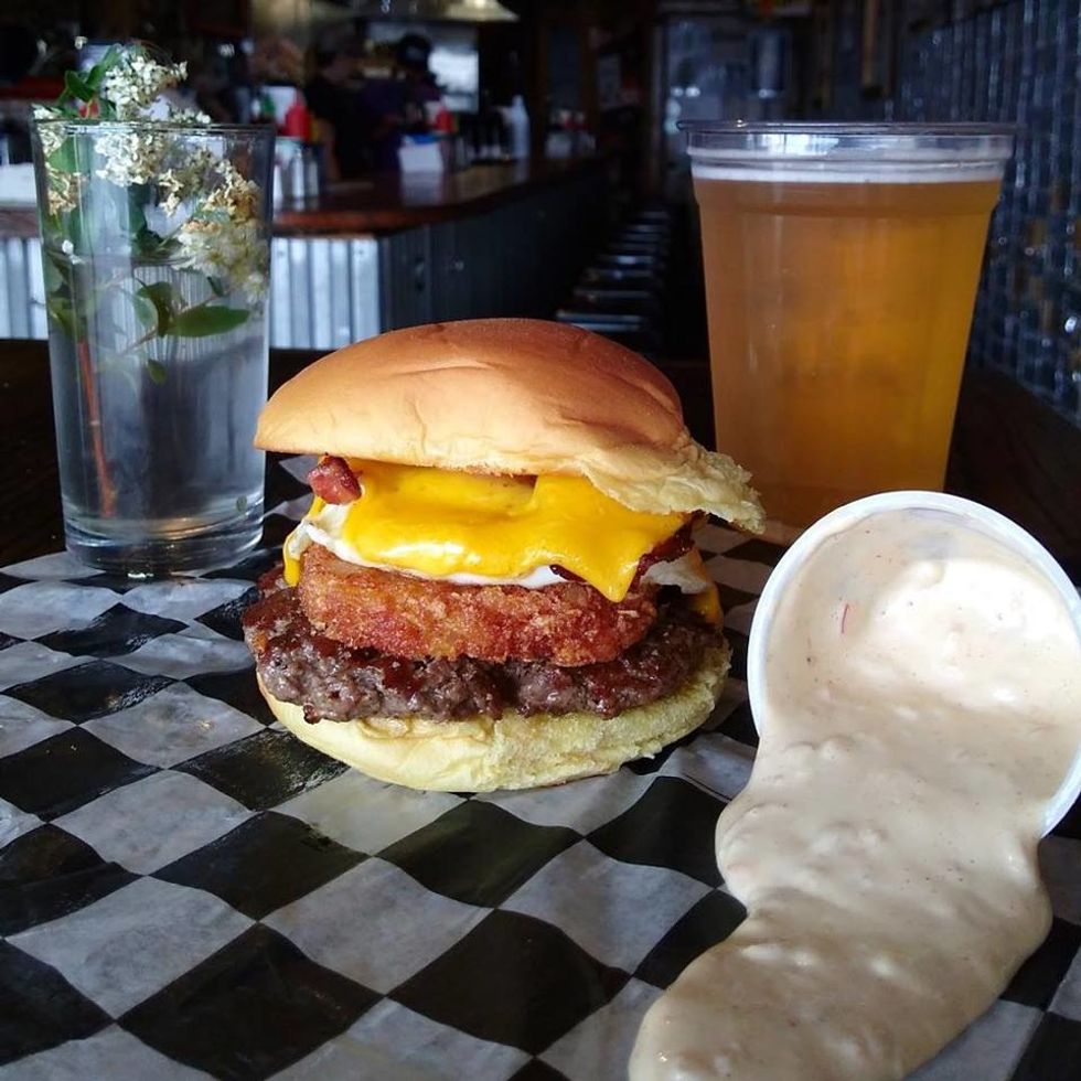 Known as a beer and burger joint, Jack Brown's is mainly a bar that happens to sell very delicious burgers. Their menu is known to feature unique and crave-able burgers rather than the traditional and well-known combination of a patty, veggies and cheese. This includes "The Elvis" which is a burger topped with peanut butter, mayonnaise, Applewood smoked bacon, and cheese, as well as "Jack on Piggy Back" which is a burger topped with a split and griddled hot dog, pickled jalapeños, and cheddar cheese. Each burger also comes with a "special sauce" that ties all of the flavors together.