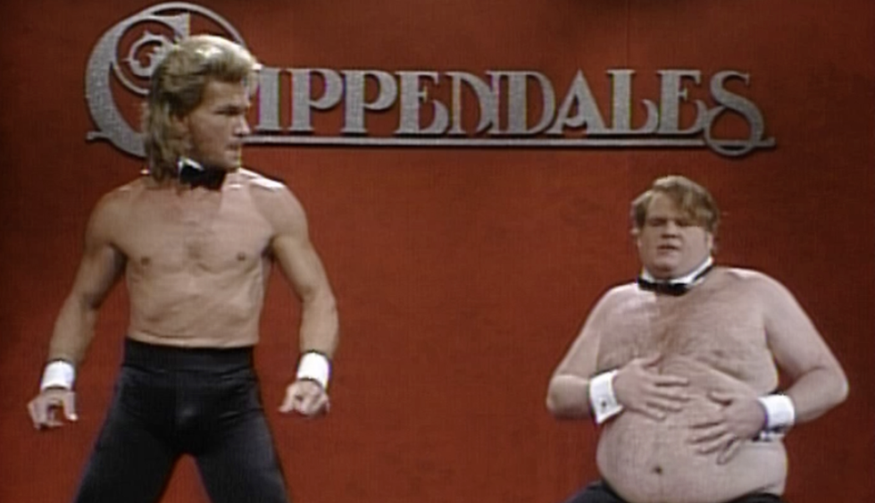 Chris Farley and Patrick Swayze were amazing in this skit together. They only have the budget to hire one dancer so Farley and Swayze both get a call back to dance side by side. Even though they have totally different body types they both agree that they are amazing dancers.