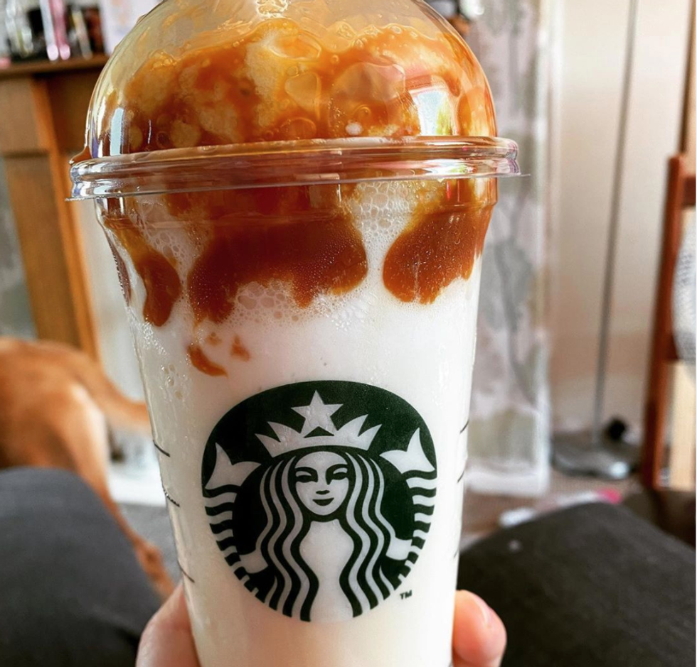 Personally, while this is my favorite drink on the list, the ingredients can appear to be a somewhat weird combination. So, a caramel apple spice basically consists of steamed apple juice, cinnamon dolce syrup pumps, and it is topped off with whipped cream and caramel drizzle.