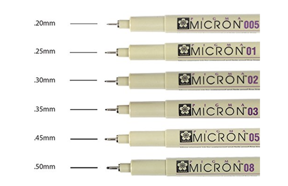 Micron pens are the best fine tip markers I've come across so far. The quality is awesome and they last for a long period of time. The 6 pack also includes a variety of different nib sizes to suit any and every design project you work on.
