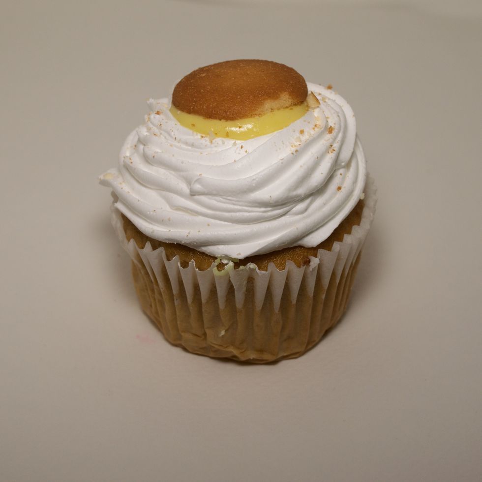 This banana cake is injected with a delicious bavarian cream and topped with whipped cream frosting and a vanilla wafer! You wouldn't want to miss out on this sweet treat!