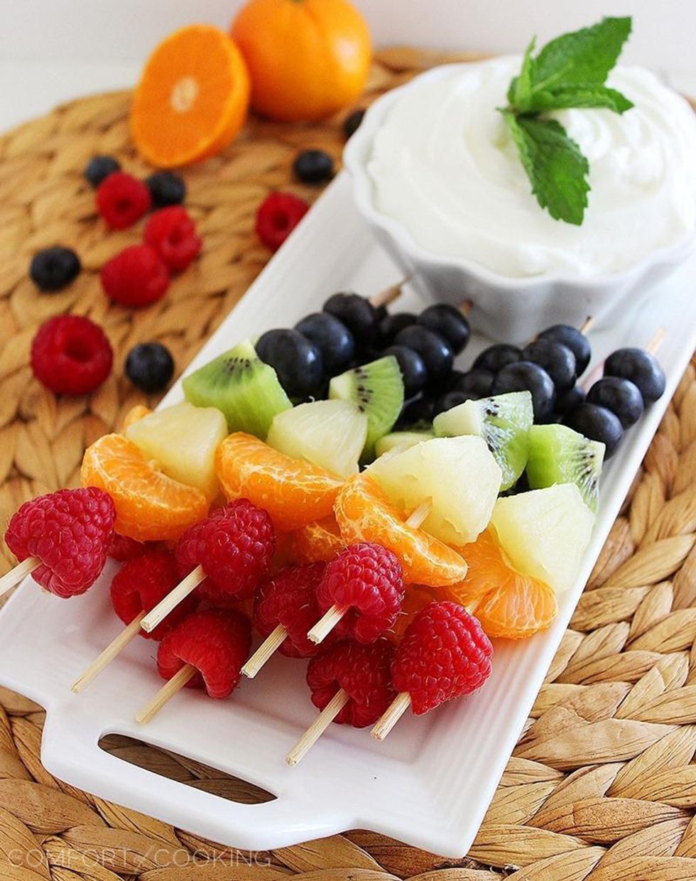Similar to vegetables, fruits are a tough one to bring into a junk food fest. A simple thing to create is fruit skewers with a honey yogurt dip. The skewers will add a refreshing and "non-healthy" appearance to the dish. Also, these can easily be decorated with the colors of the teams playing in the Super Bowl. For example, a skewer decorated for the Patriots could have blueberries and red raspberries. Fruit kabobs are a cute, festive, snack that will take minimal time and something everyone can look forward to.