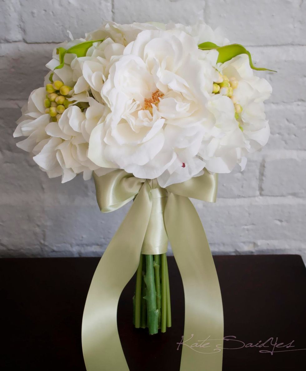 White roses mixed with hydrangea, touches of calla lilies, and elegant greens