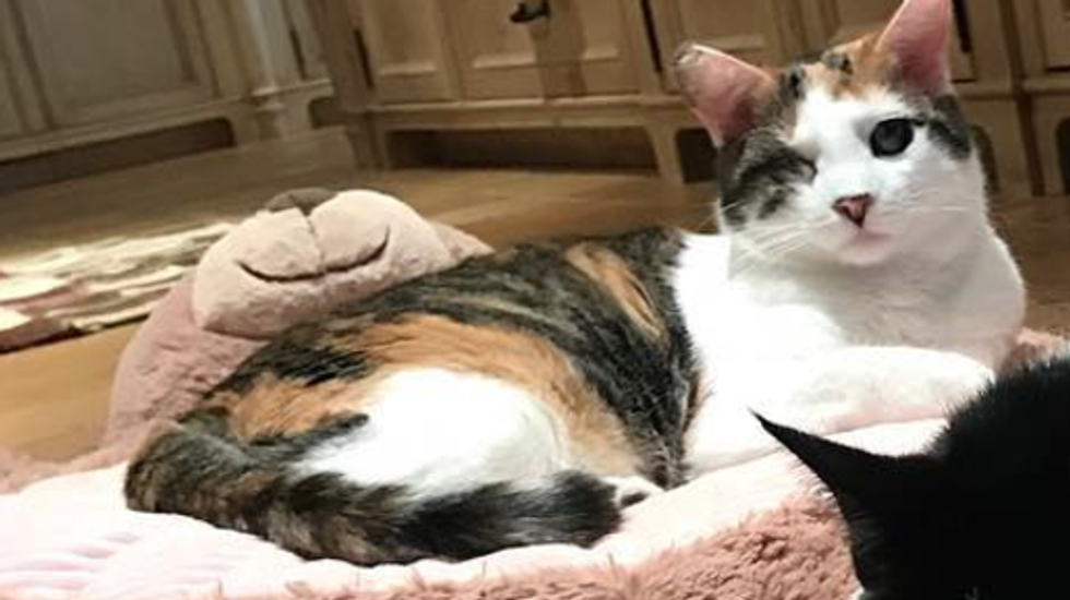 Bella, a completely blind calico, was abandoned by her owner. After being abandoned, Bella was attacked by a dog and had to have one of her eyes removed due to the previous trauma. Despite their many attempts to find Bella a home, Howard and Beth couldn’t seem to find a forever for Bella, so they became her forever family.