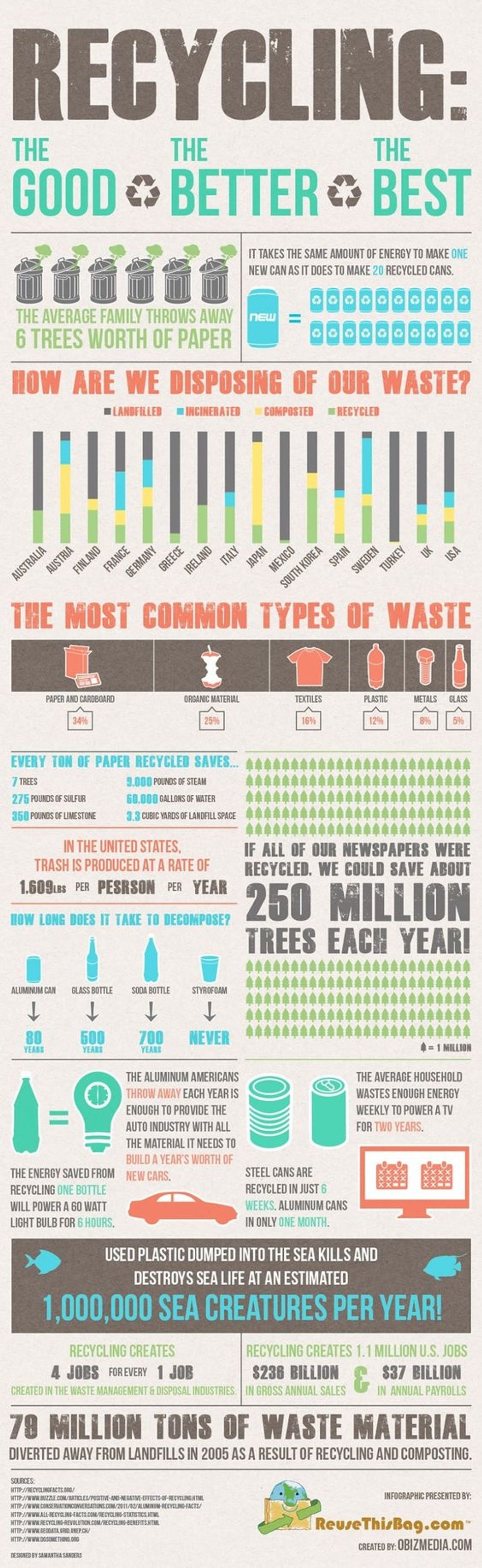 - Using eco-friendly reusable bags is a cheap and effective way to help our Mother Earth. It takes about 1000 years for plastic bags to decompose and there’s over eight million tons of plastic trash finding its way into the oceans every year. There’s even a floating gyre of plastic waste in the ocean called “The Great Pacific Garbage Patch”! Just this big heap of garbage traveling the ocean, can you believe that? Every year nearly 1 million sea creatures are killed because of the mass amount of waste in their homes.